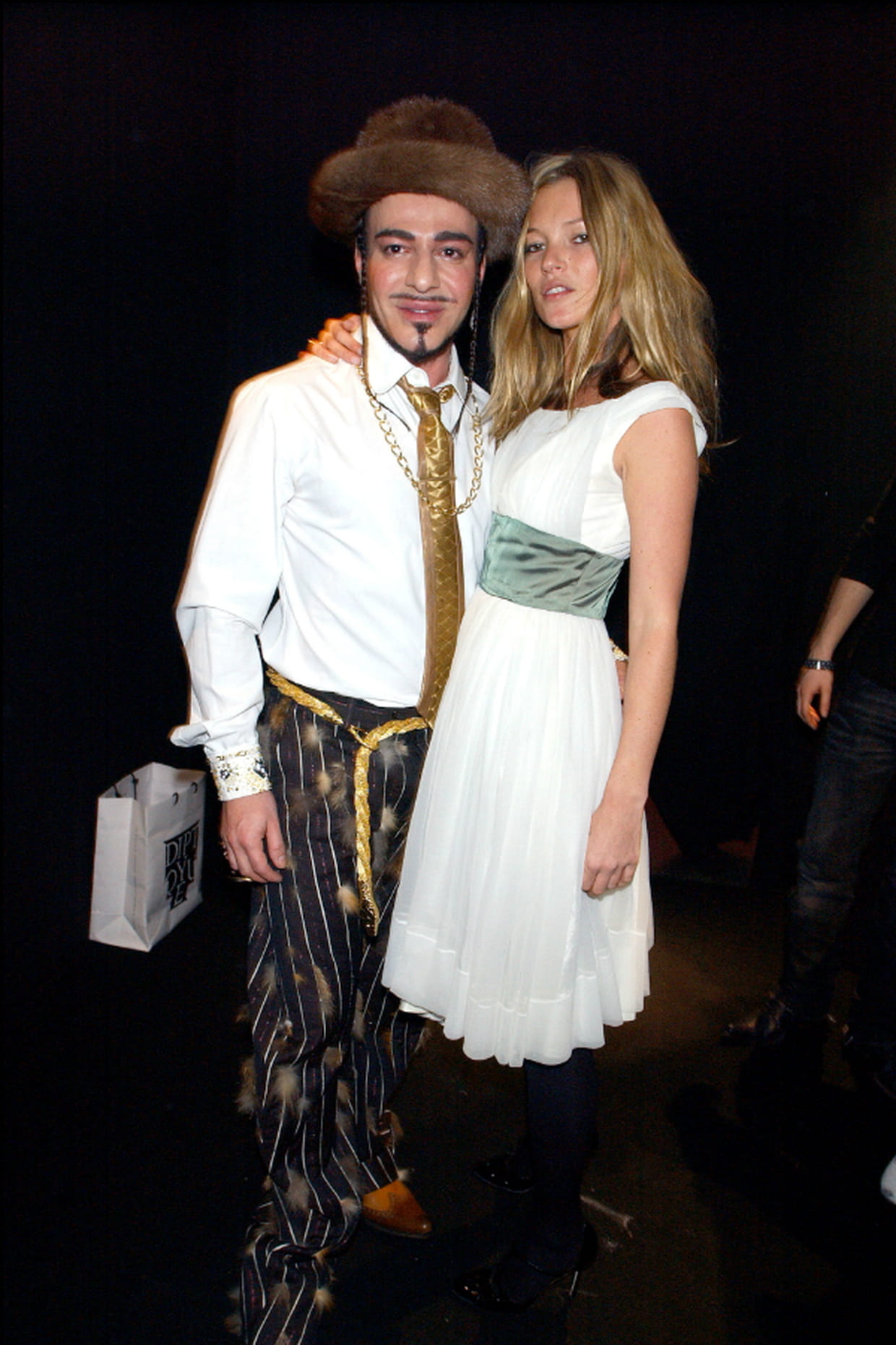 Kate Moss en robe Galliano avec le styliste John Galliano juste après son défilé lors de la fashion week automne-hiver 2004-2005 à Paris le 7 mars 2004.