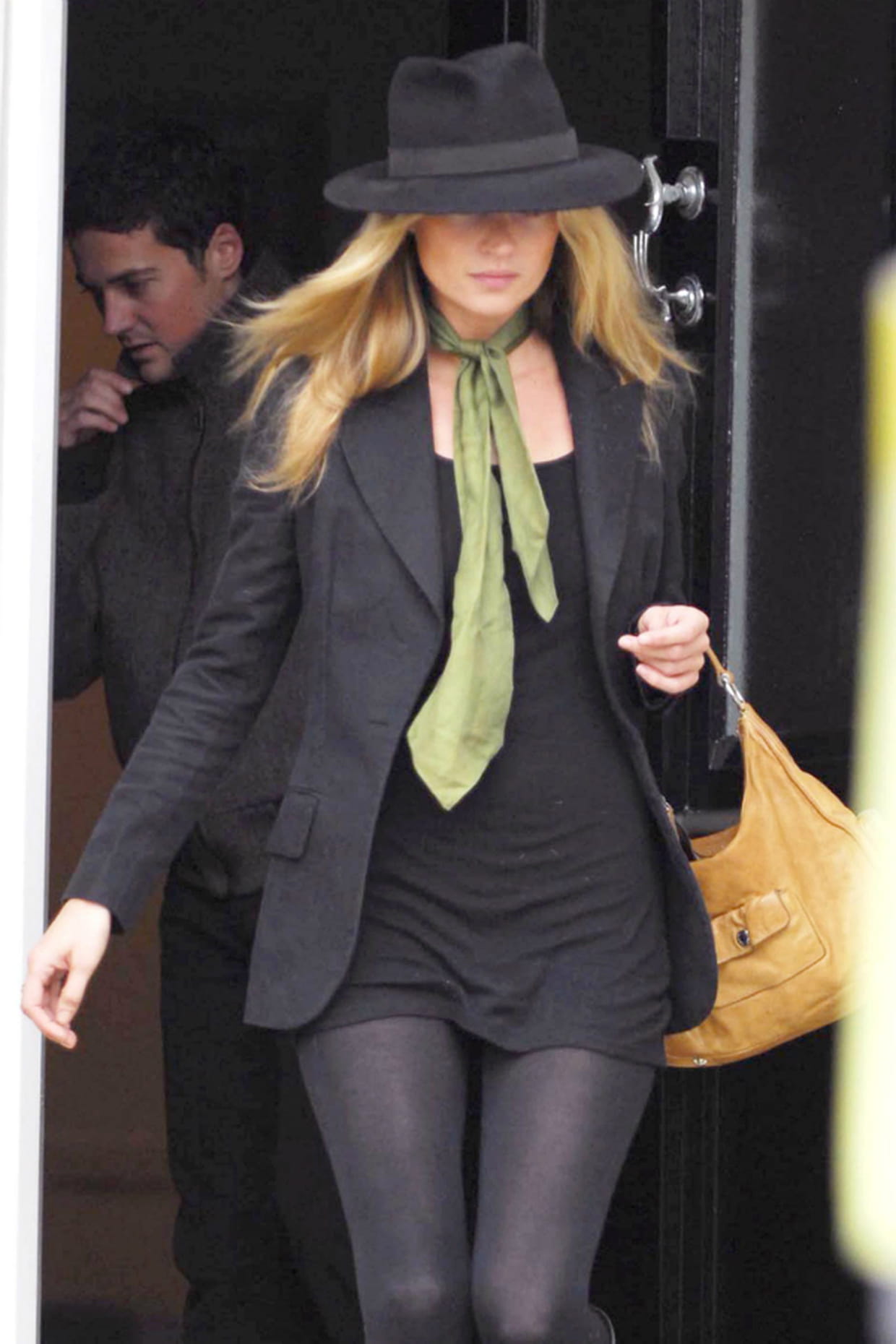 Kate Moss avec un foulard noué en lavallière dans les rues de Londres le 28 mars 2006.