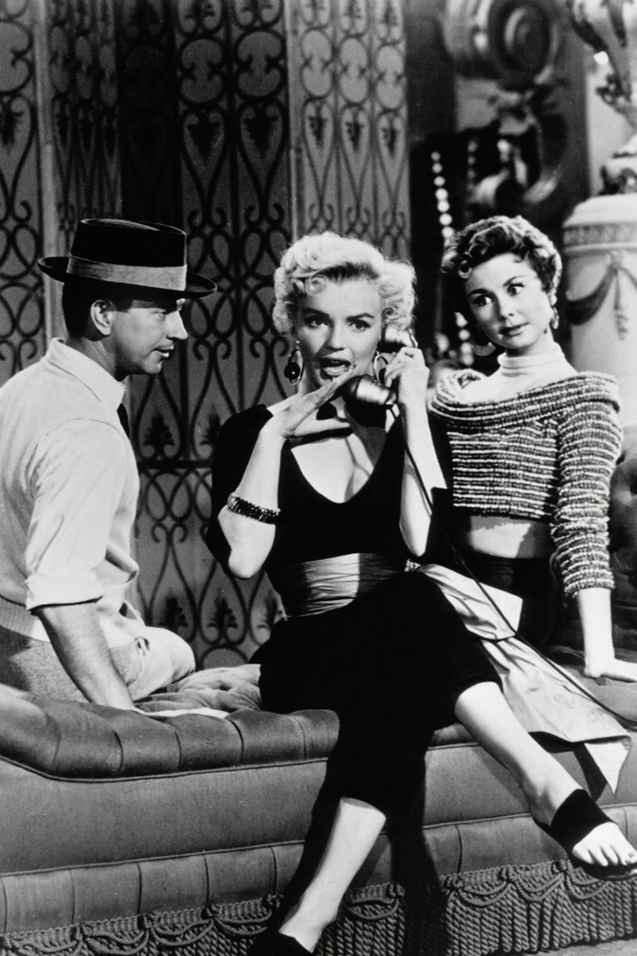 Marilyn Monroe en ensemble noir et ceinture XXL avec les acteurs Donald O'Connor et Mitzi Gaynor dans le film La joyeuse parade en 1954.