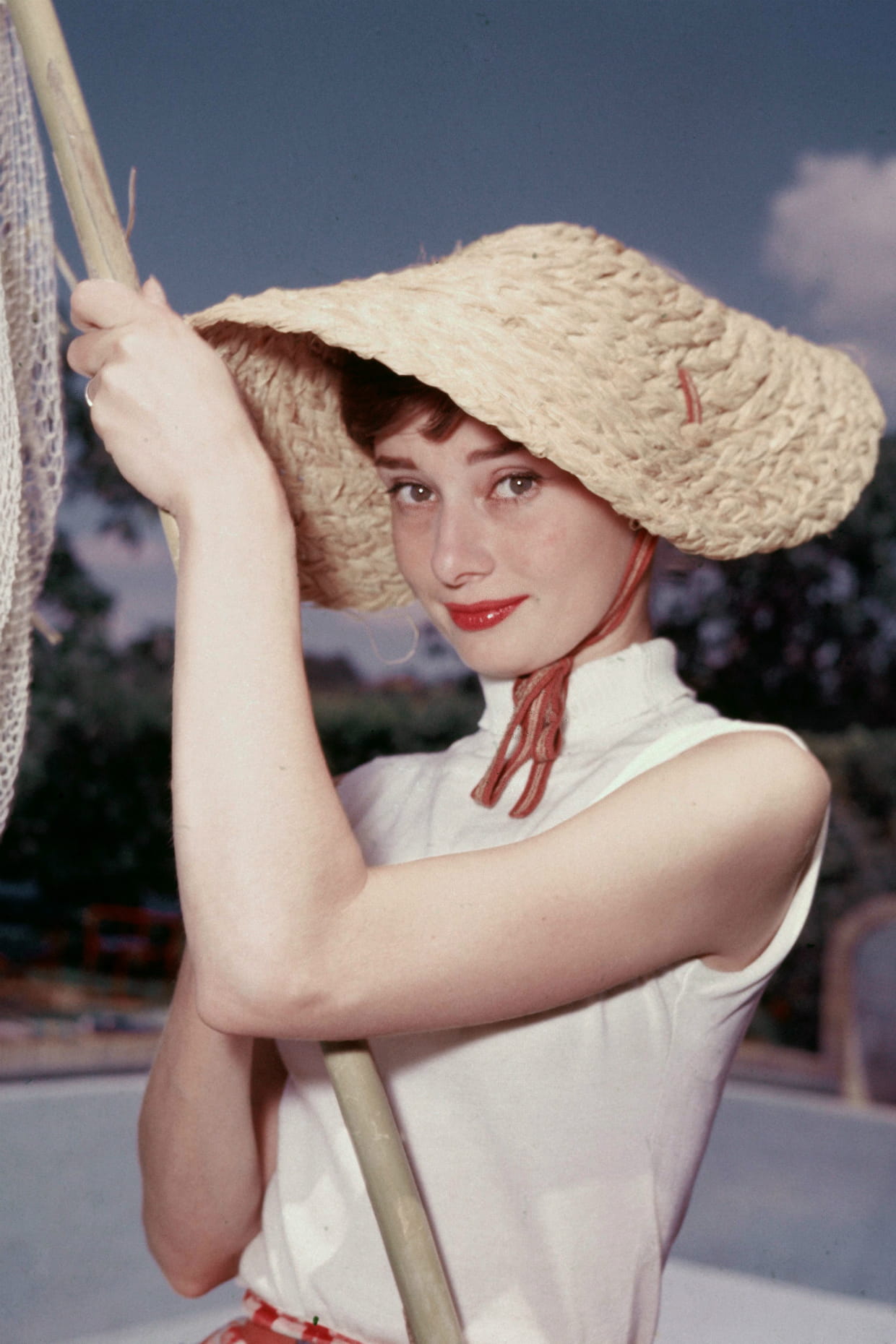 Audrey Hepburn en col roulé blanc sans manches avec un chapeau de paille en 1952.