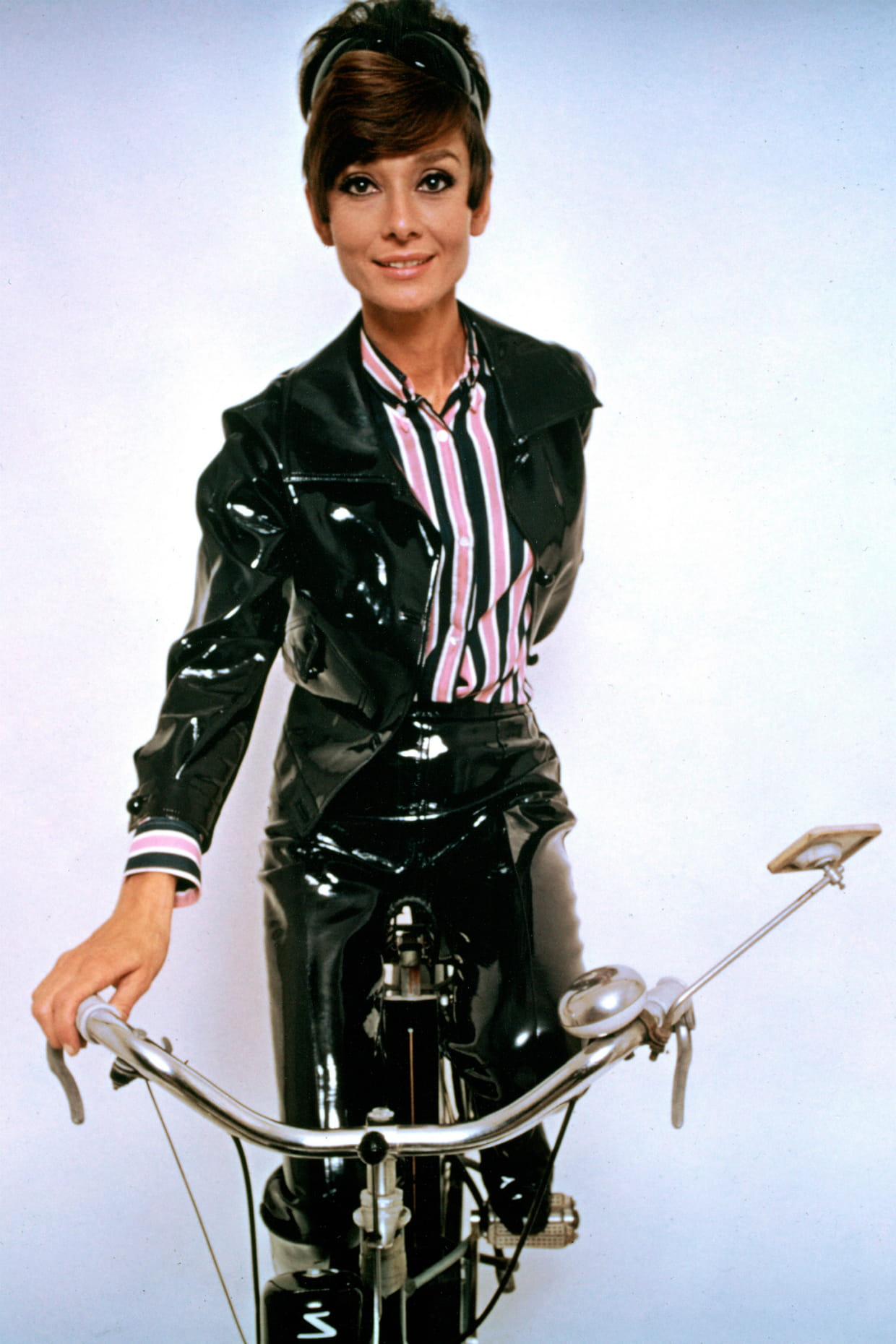 Audrey Hepburn en pantalon et veste en vinyle noir en 1967.