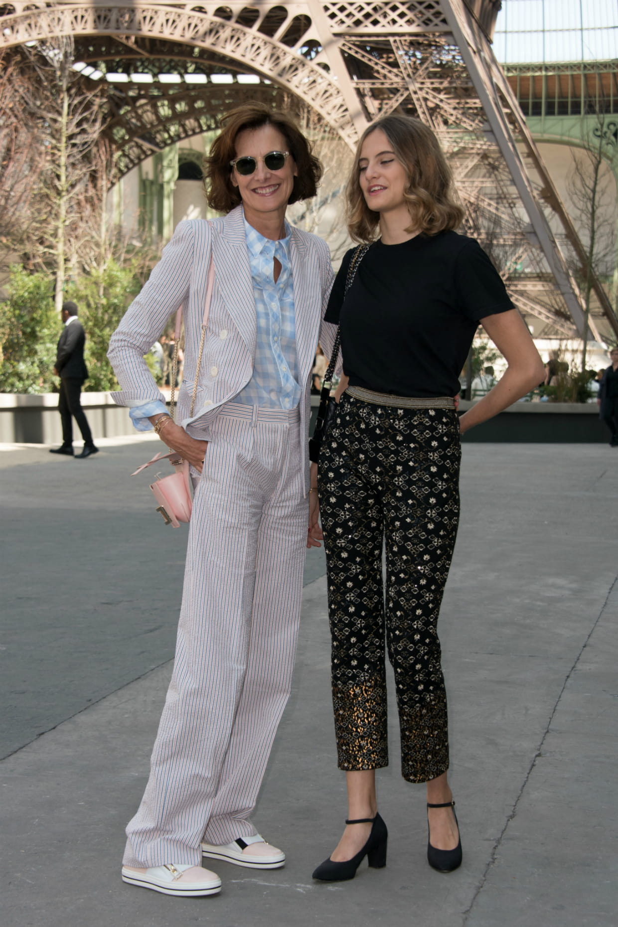 Inès de la Fressange en costume pastel et baskets blanches avec sa fille Violette à Paris le 4 juillet 2017.