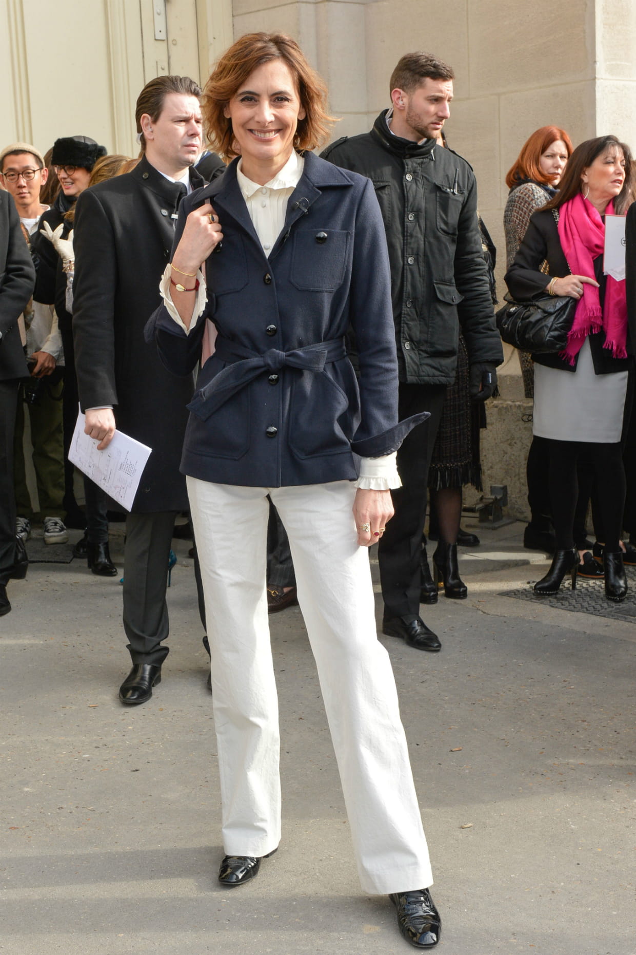 Inès de la Fressange en veste ceinturée bleu et pantalon blanc à Paris le 8 mars 2016.