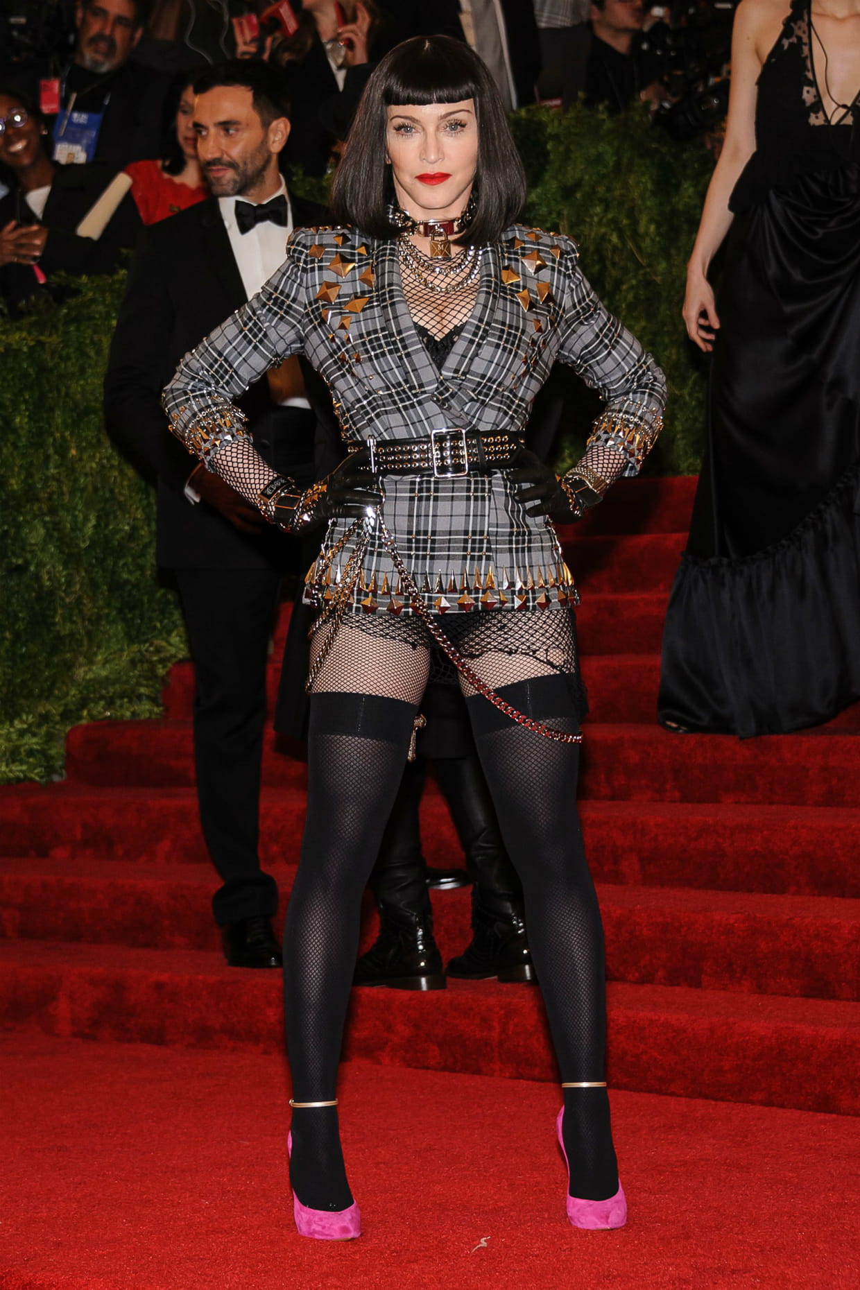 Madonna en veste à carreaux ceinturée lors du Met Gala à New York le 6 mai 2013.