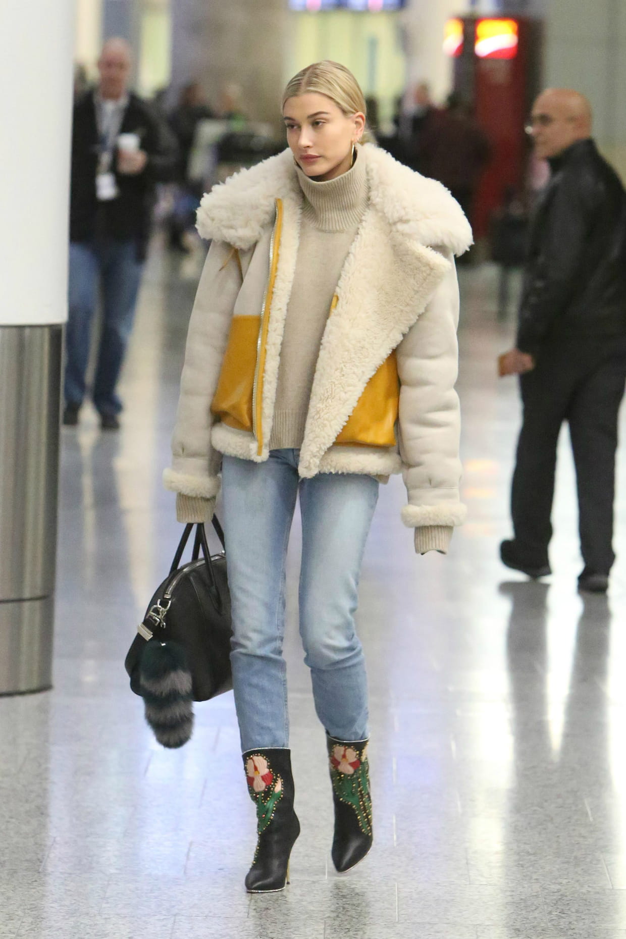 Hailey Bieber en veste aviateur à l'aéroport de Toronto au Canada, le 8 décembre 2017