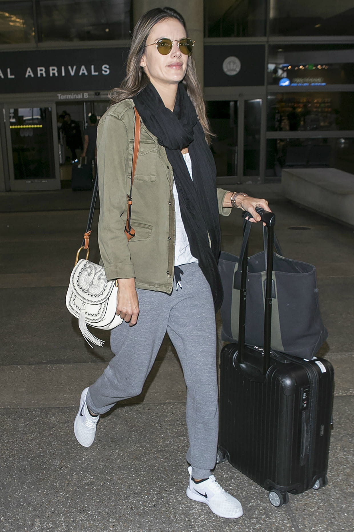 Alessandra Ambrosio en veste kaki à l’aéroport international de Los Angeles, le 28 mars 2018