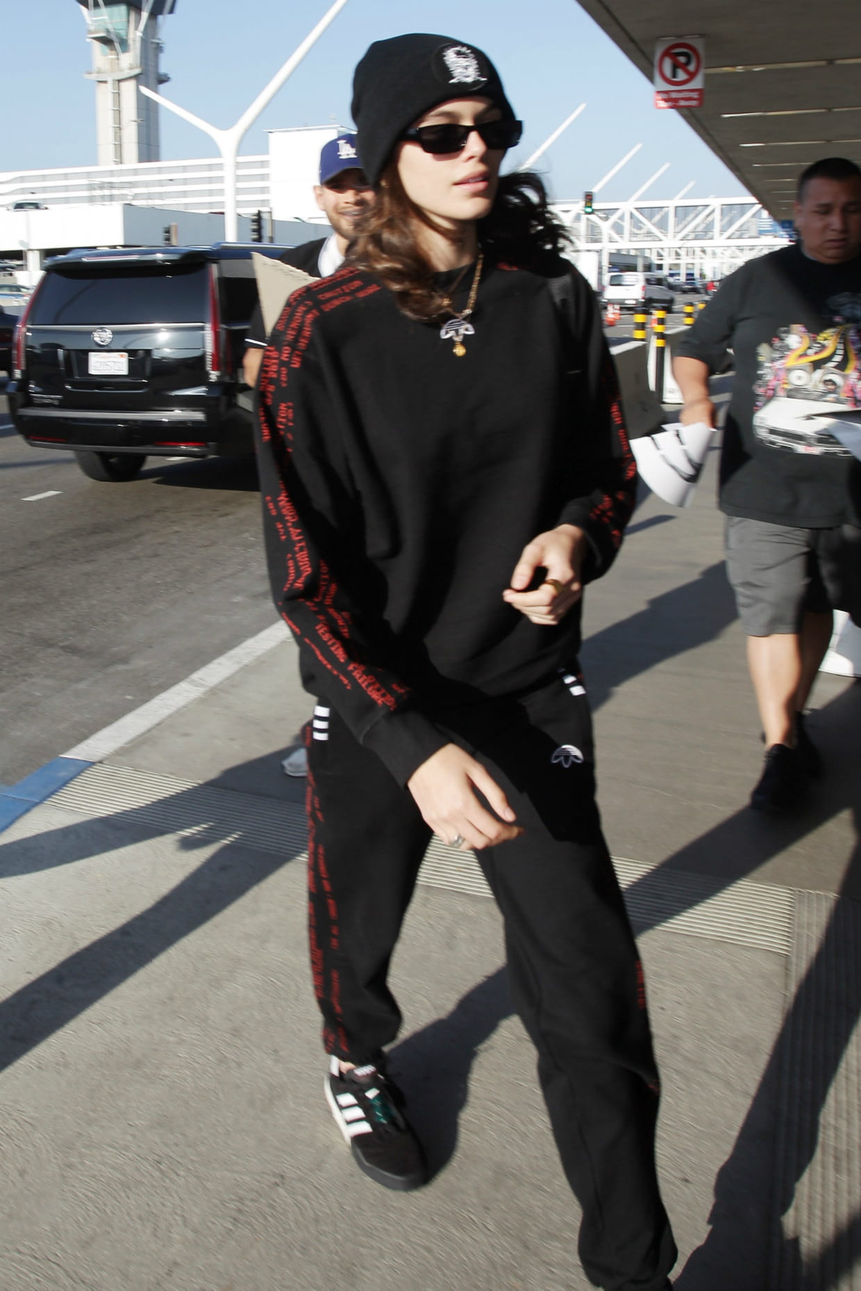 Kaia Gerber en ensemble noir à l’aéroport international de Los Angeles, le 23 mai 2018