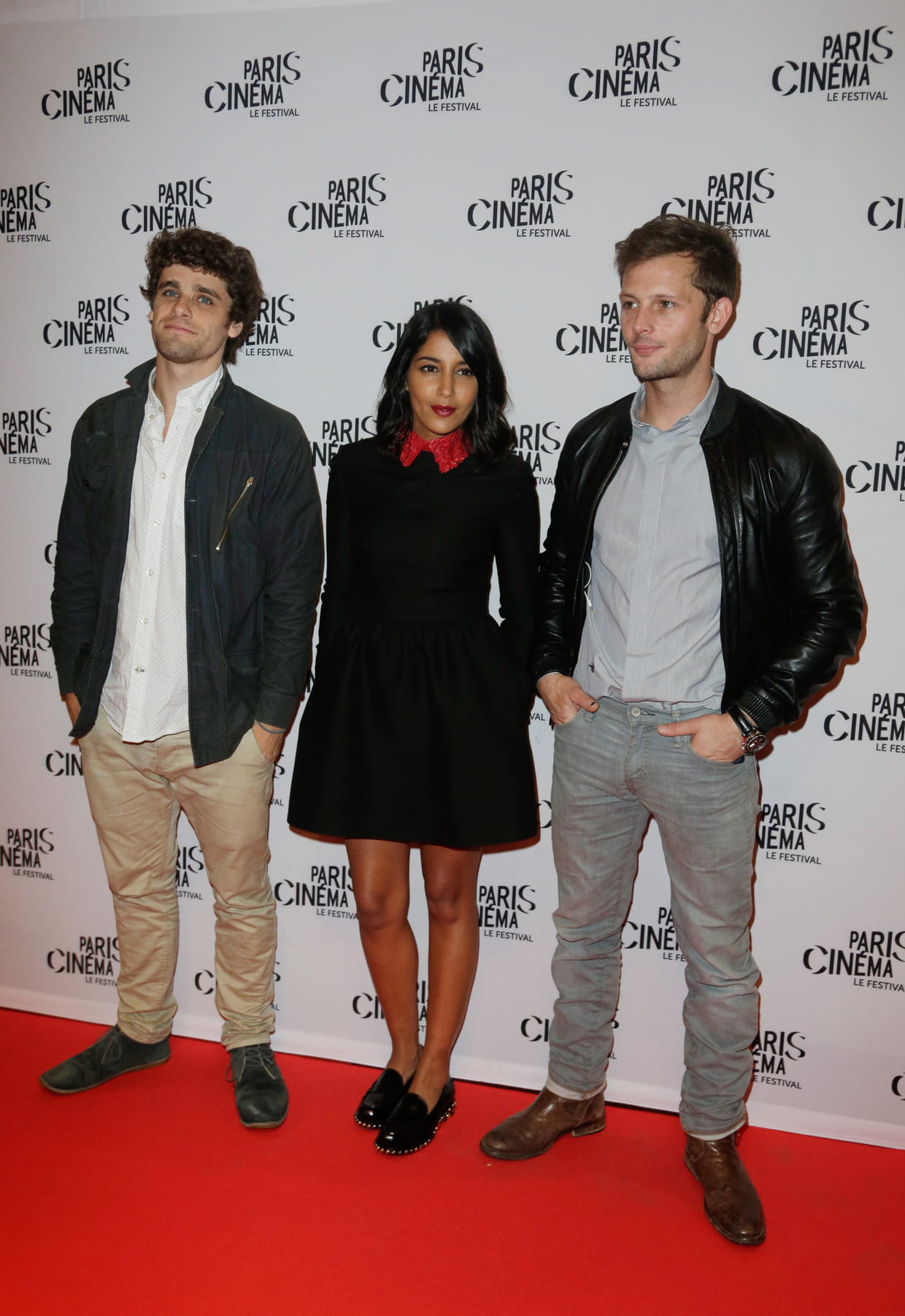 Leïla Bekhti en robe noire à col claudine rouge et mocassins avec les acteurs Arthur Dupont et Nicolas Duvauchelle à l'émission Maintenant ou jamais pendant le festival du cinéma parisien au Gaumont Opéra à Paris le 10 juillet 2014.