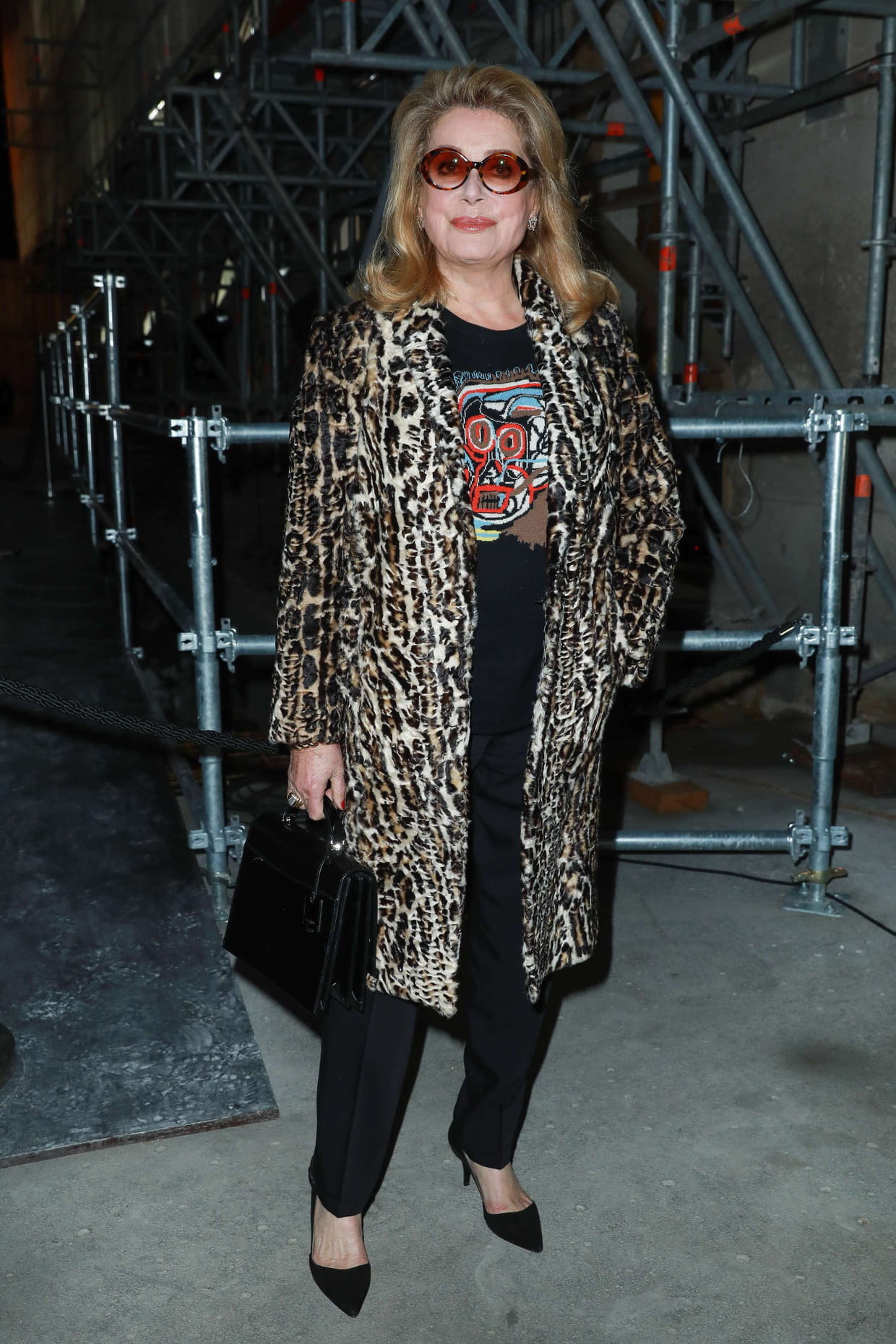 Catherine Deneuve (1943) en manteau léopard au défilé Saint Laurent lors de la fashion week automne-hiver 2018 à Paris le 28 février 2017.