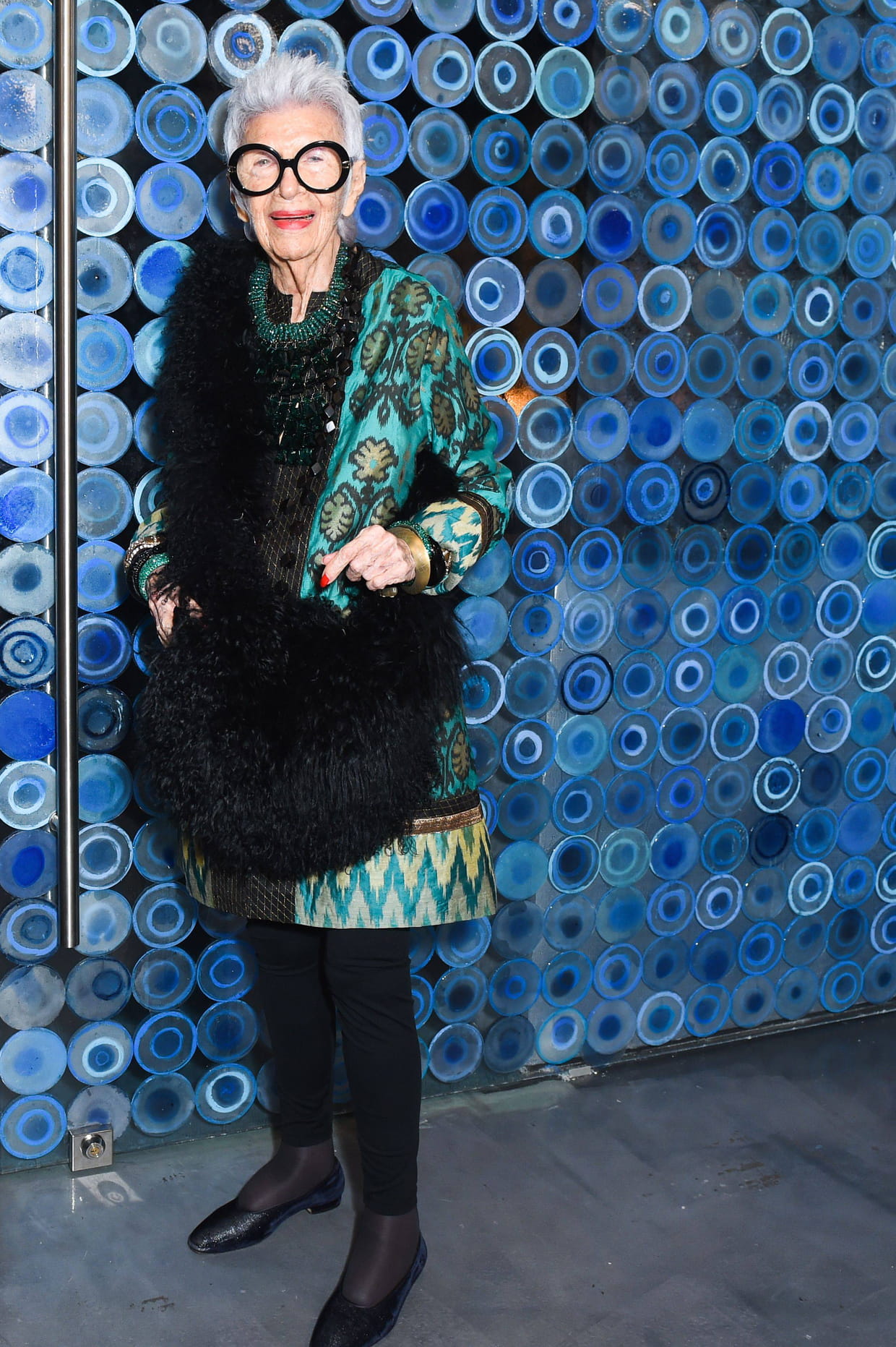 Iris Apfel (1921) en manteau coloré à l'ouverture du concept store 10 Corso Como à New York le 6 septembre 2018.