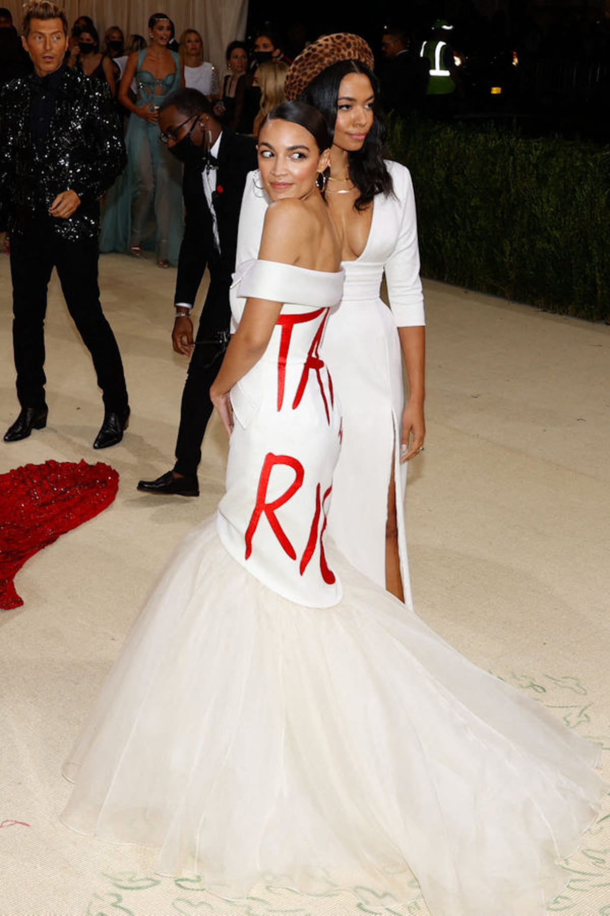 Alexandria Ocasio-Cortez en robe à slogan "Tax The Rich" Aurora James au Met Gala à New York le 13 septembre 2021.