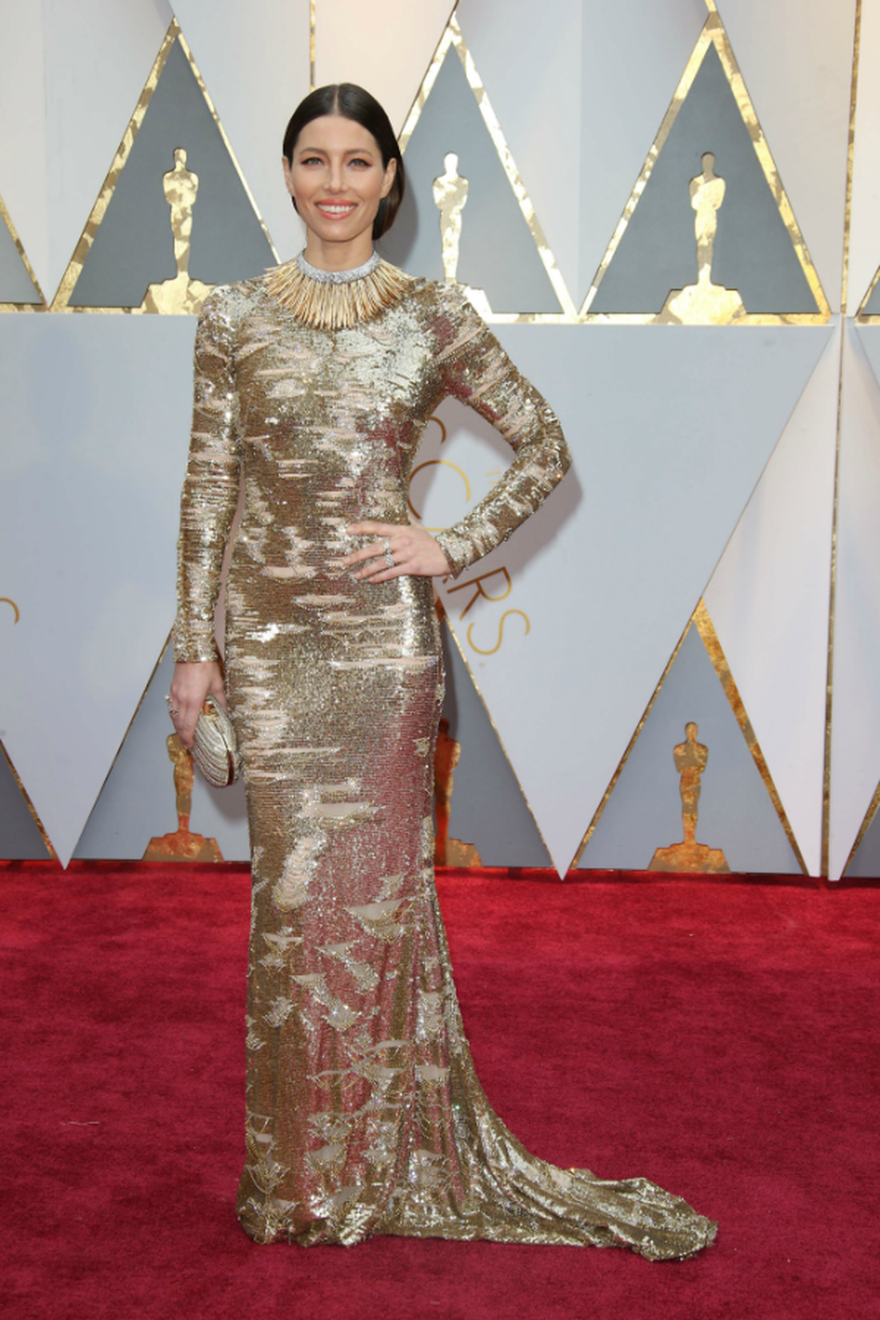 Jessica Biel en robe texturée à paillettes aux Oscars 2017.