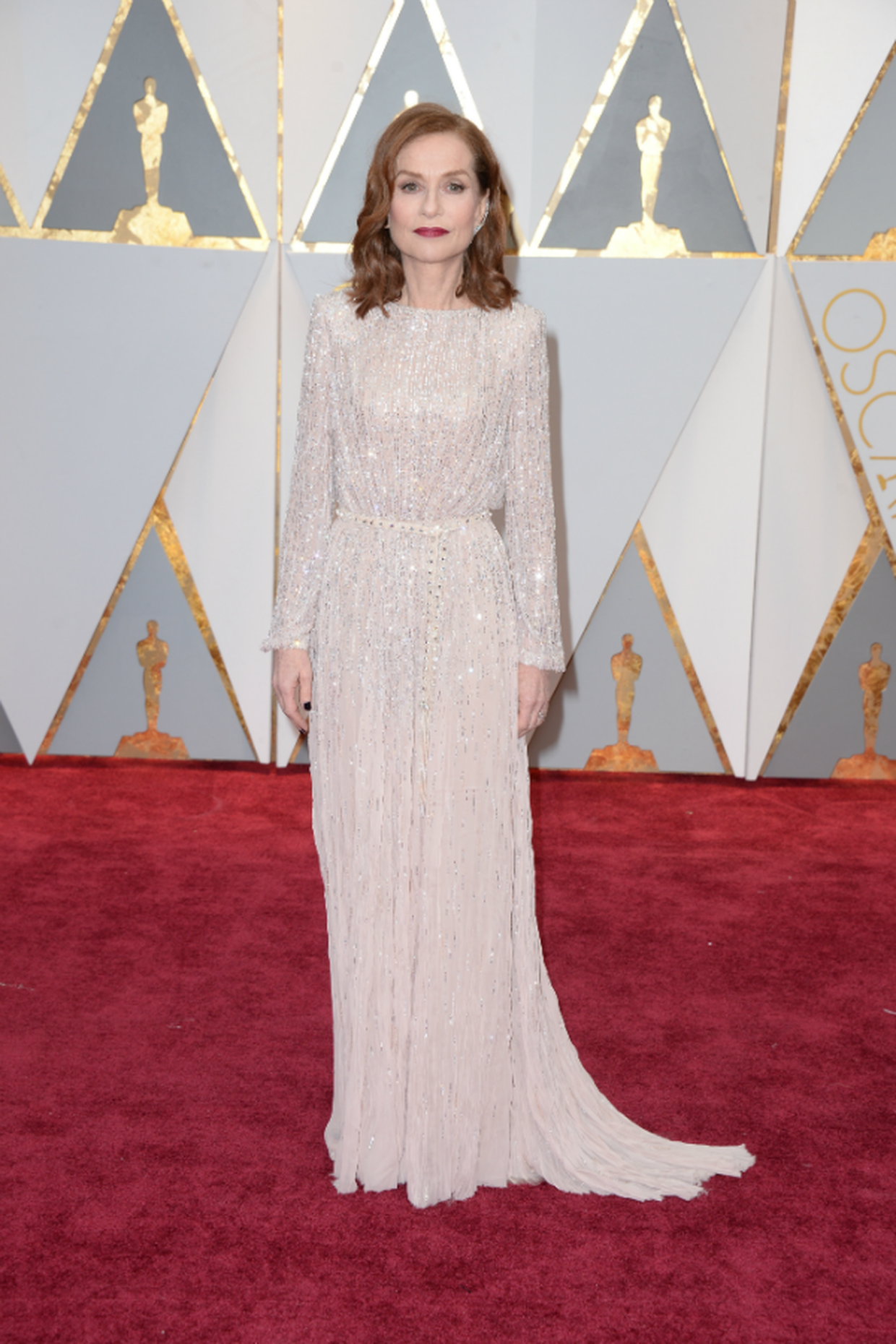 Isabelle Huppert en robe immaculée à paillettes aux Oscars 2017.