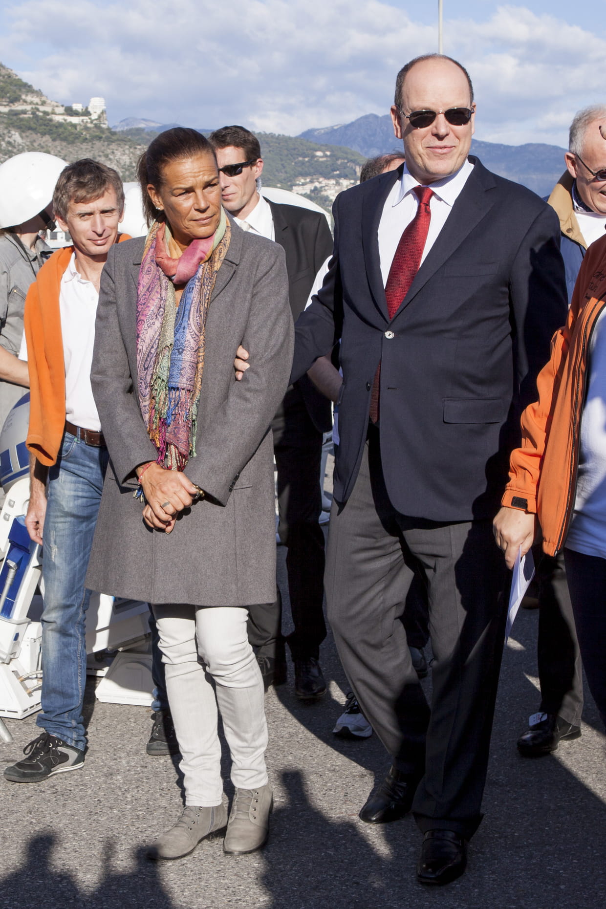 Stéphanie de Monaco en jean gris clair et manteau anthracite avec Albert II lors du départ de la course caritative No Finish Line au port Hercule à Monaco le 16 novembre 2013.