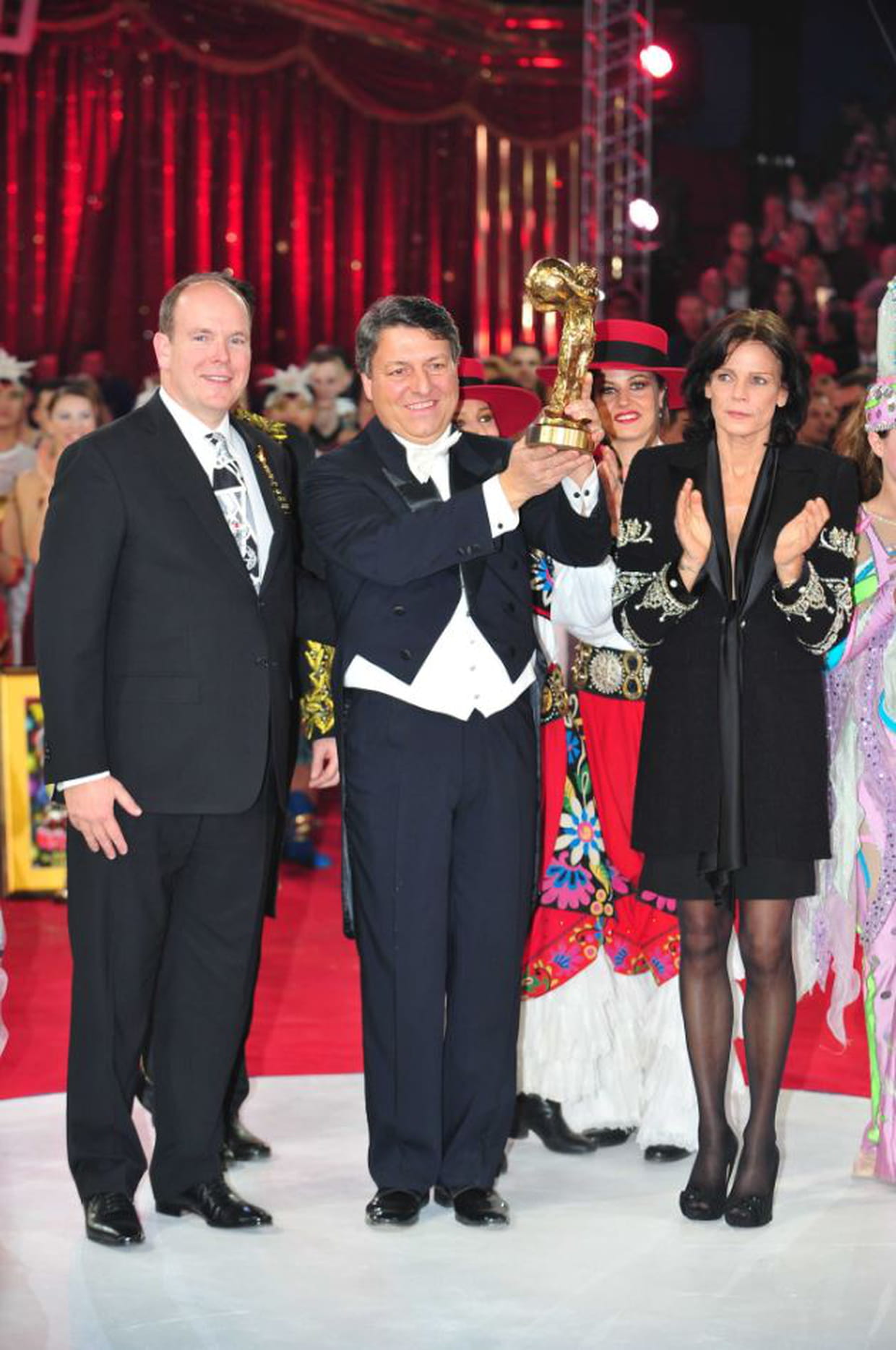 Stéphanie de Monaco en manteau droit noir avec Albert II et le dompteur Flavio Togni lors de la cérémonie de remise des prix du 36ème Festival international du cirque de Monte-Carlo à Monaco le 25 janvier 2011.