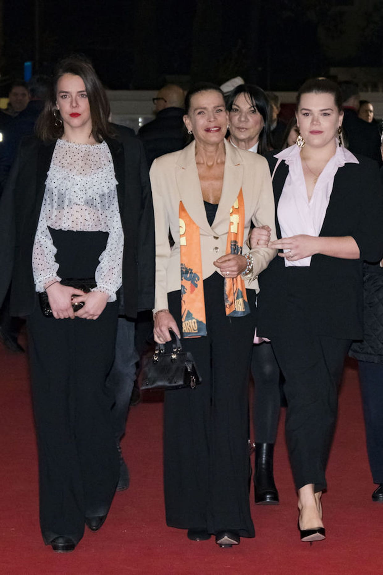 Stéphanie de Monaco en veste camel et pantalon noir avec Pauline Ducruet et Camille Gottlieb lors du 43ème Festival international du cirque de Monte-Carlo à Monaco le 19 janvier 2019.