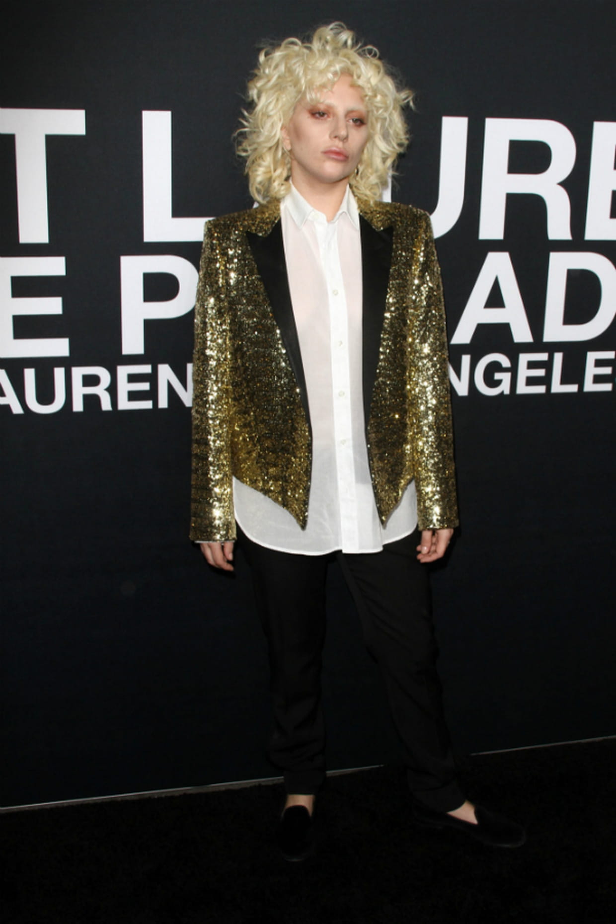 Lady Gaga en blazer doré à revers noirs et chemise blanche Saint Laurent au défilé Saint Laurent à Los Angeles le 10 février 2016.