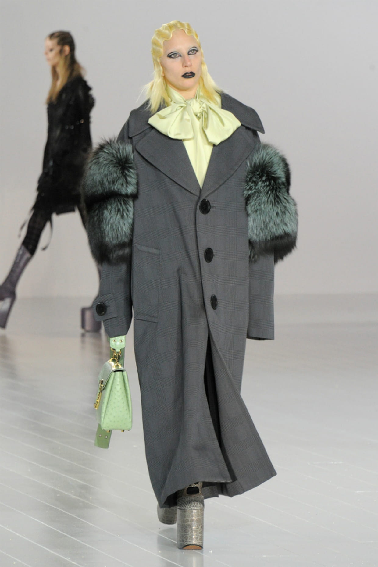 Lady Gaga en manteau gris et chemiser jaune à nœud Marc Jacobs sur le podium du défilé Marc Jacobs à New York le 18 février 2016.