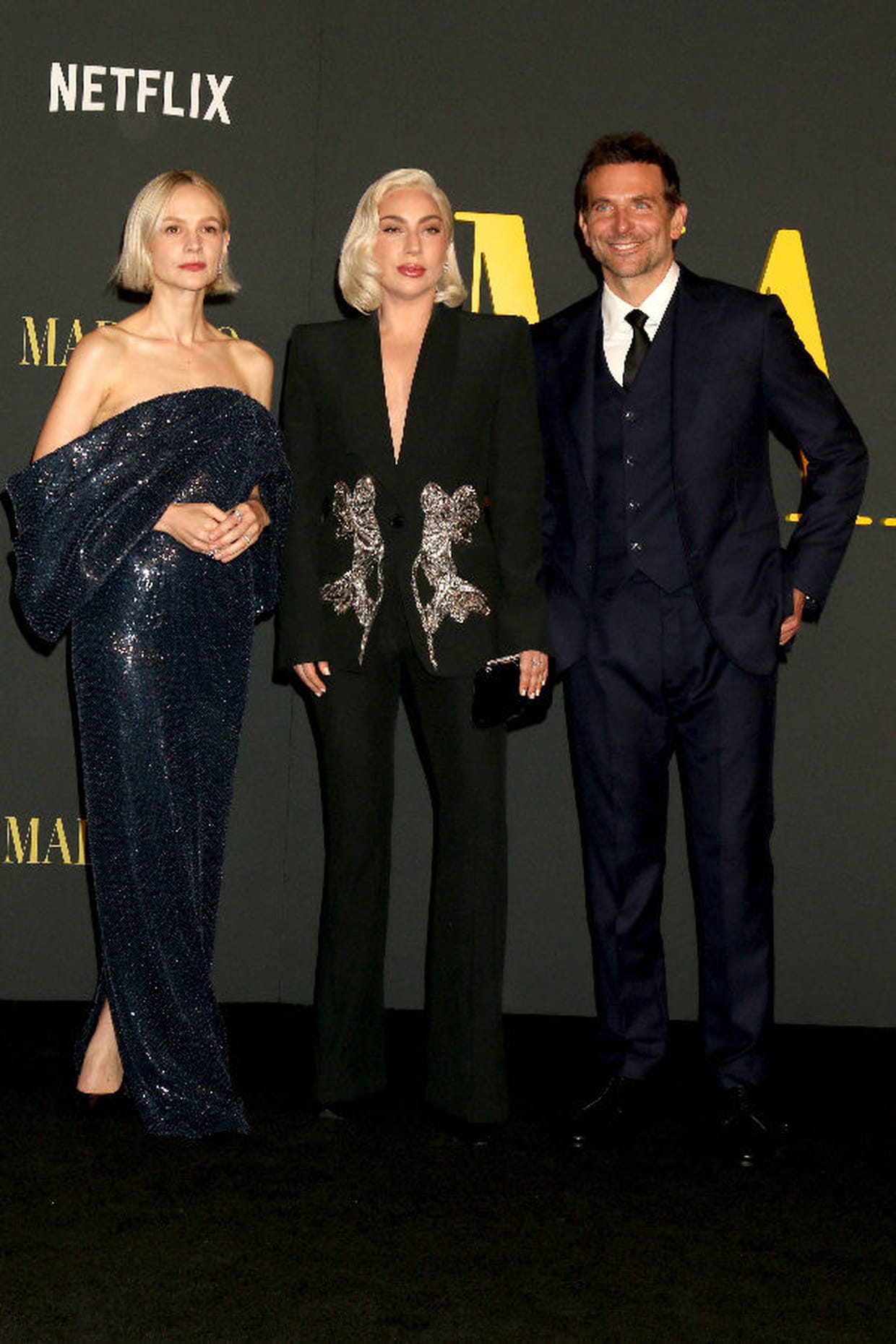 Lady Gaga en smoking noir à broderies dorées avec Bradley Cooper et Carey Mulligan lors de la diffusion du film Maestro à Los Angeles le 12 décembre 2023.
