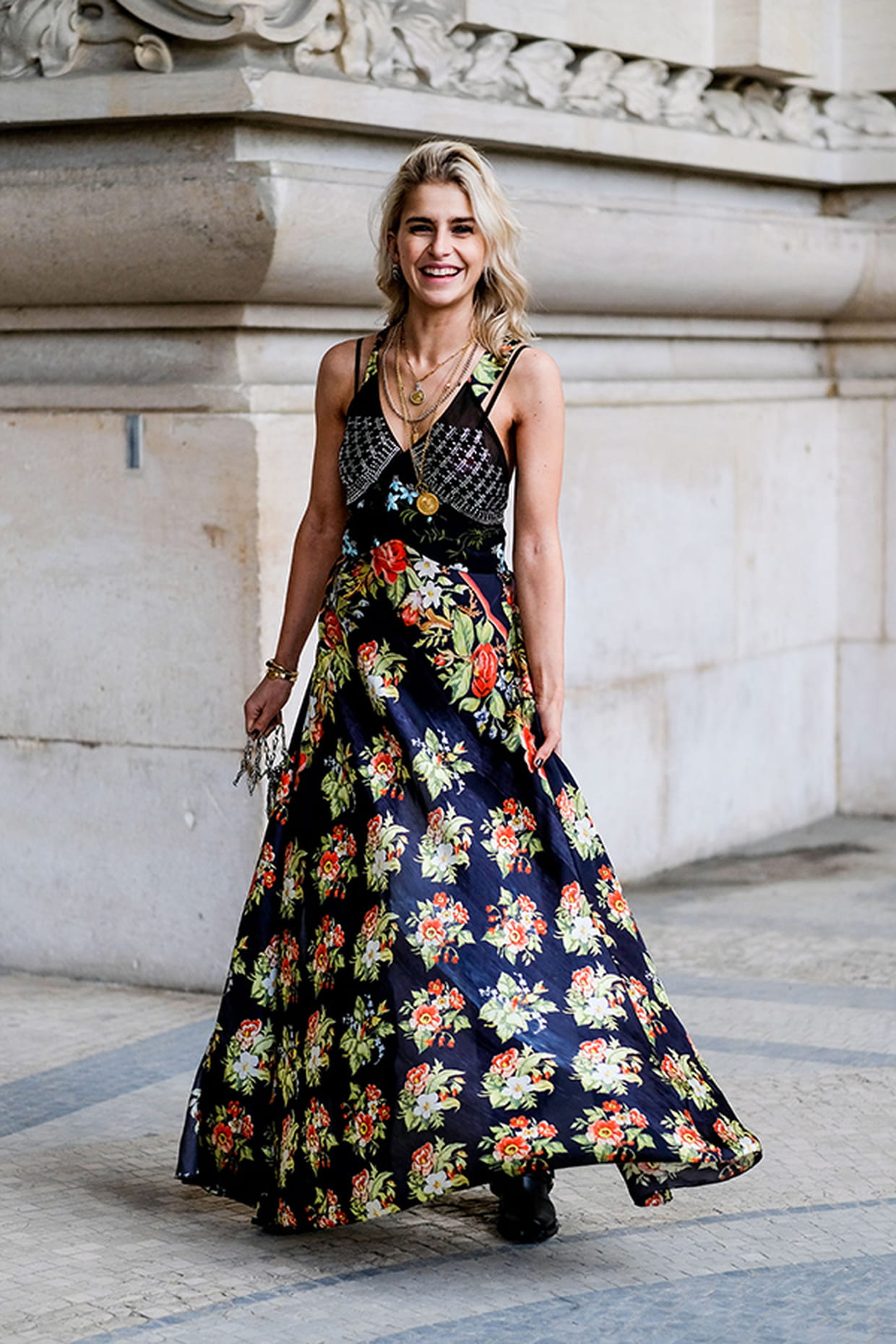 Caroline Daur en robe imprimée à fines bretelles Paco Rabanne