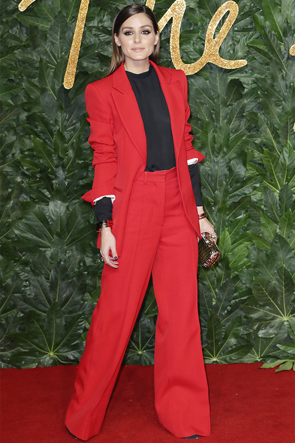 Olivia Palermo en costume rouge Victoria Beckham aux British Fashion Awards le 10 décembre 2018 à Londres.