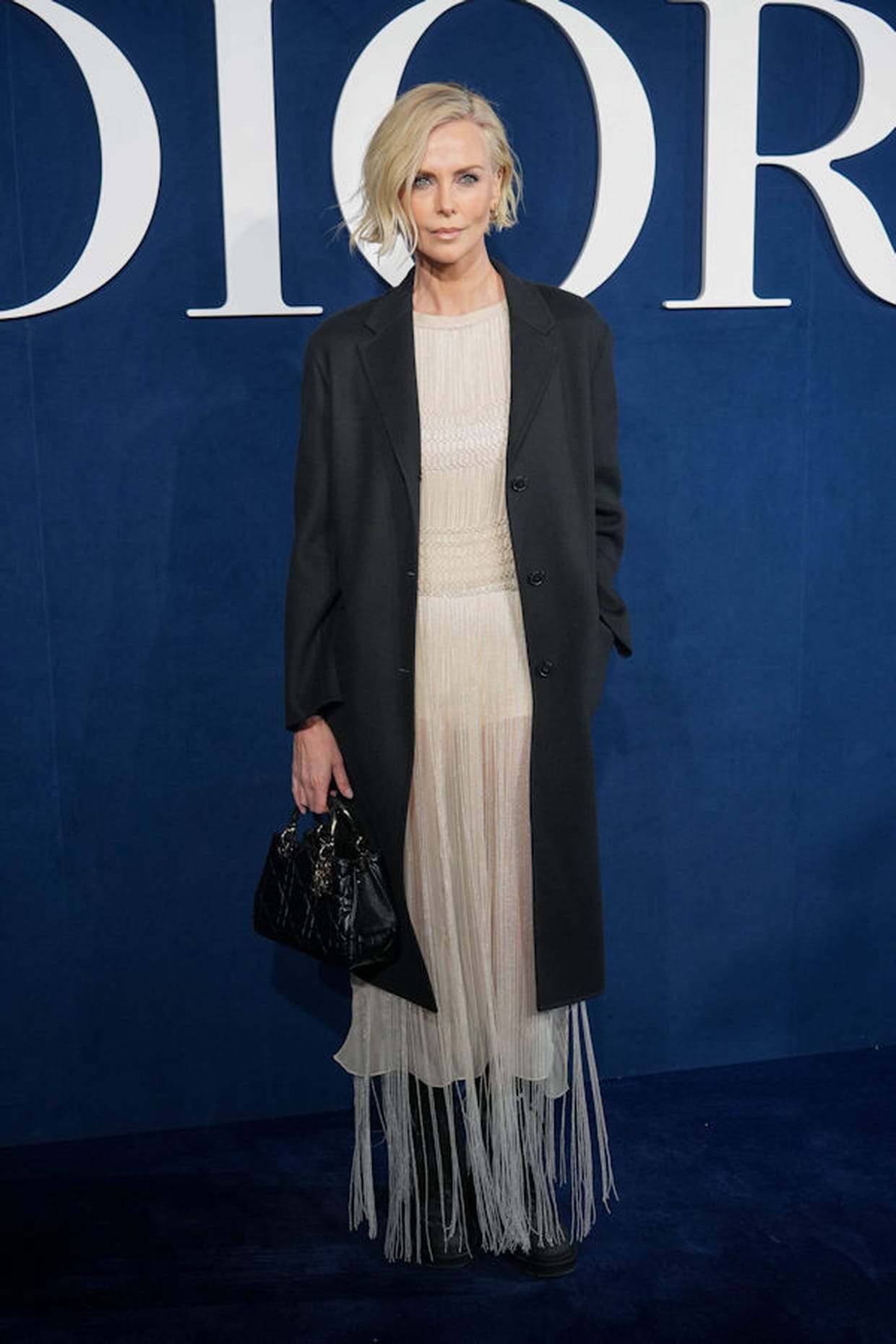 Charlize Theron en robe beige à franges et manteau noir Dior