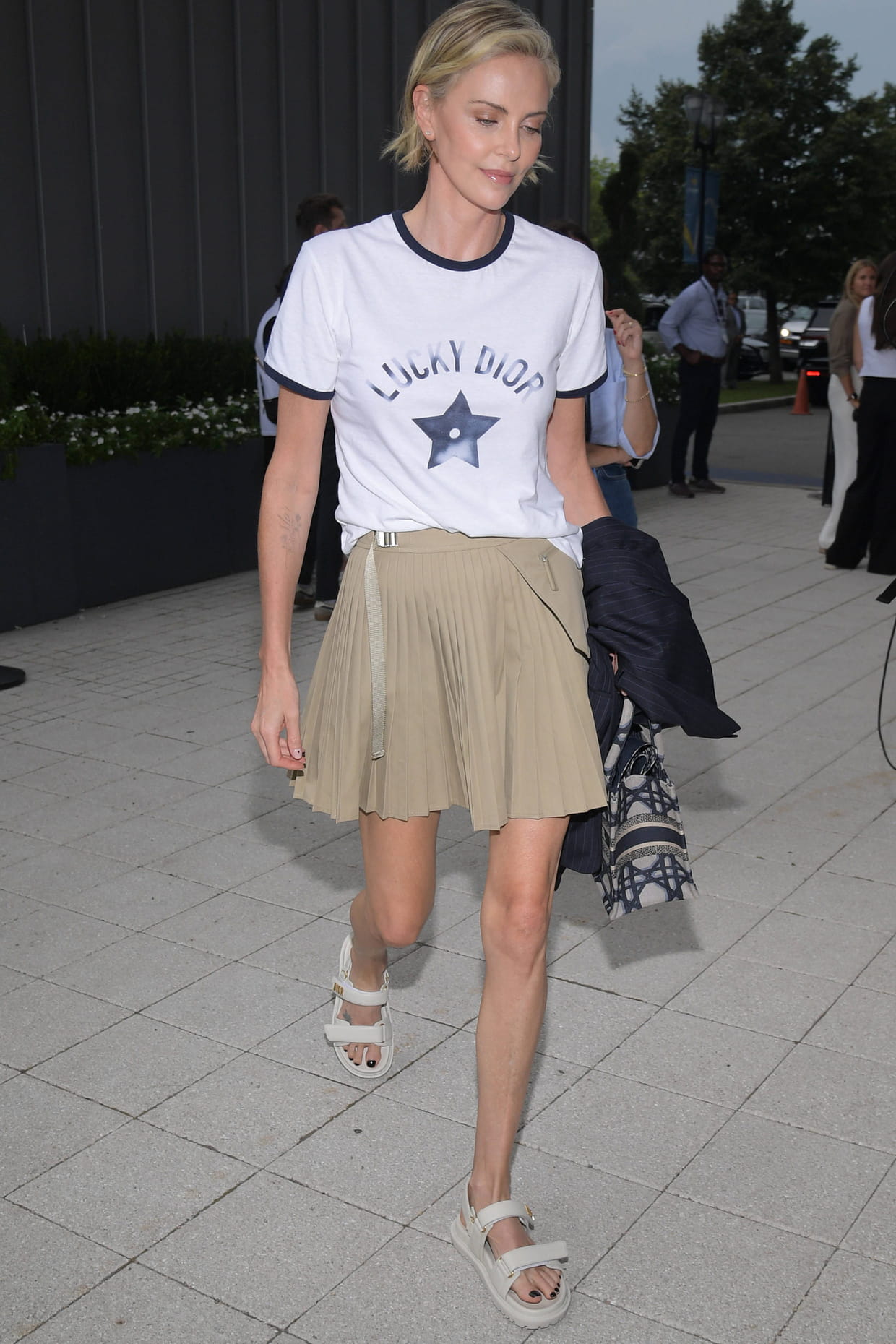 Charlize Theron en look Dior composé d'une mini-jupe beige et d'un t-shirt