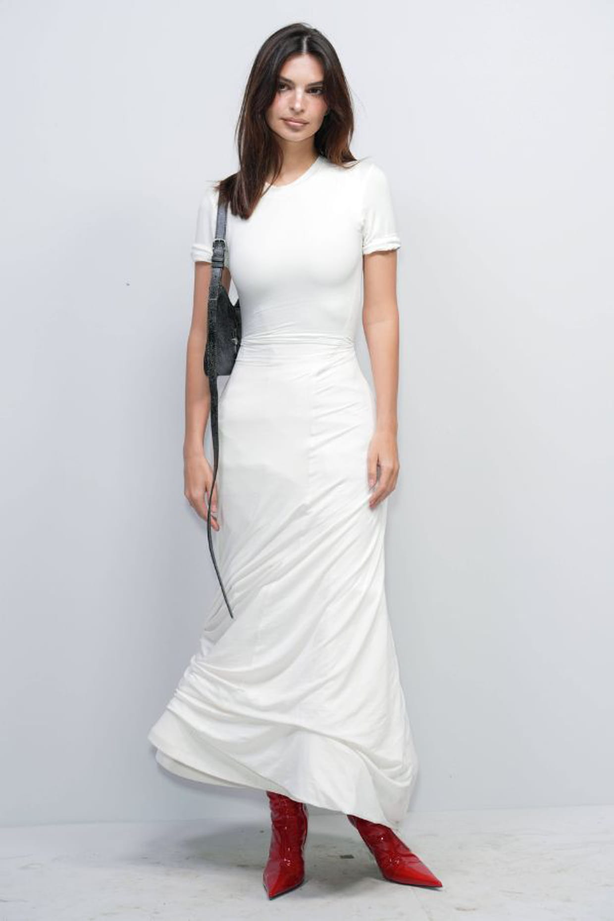 Emily Ratajkowski en robe blanche et bottes rouges au défilé Acne Studios lors de la fashion week automne-hiver 2024-2025 à Paris le 28 février 2024.