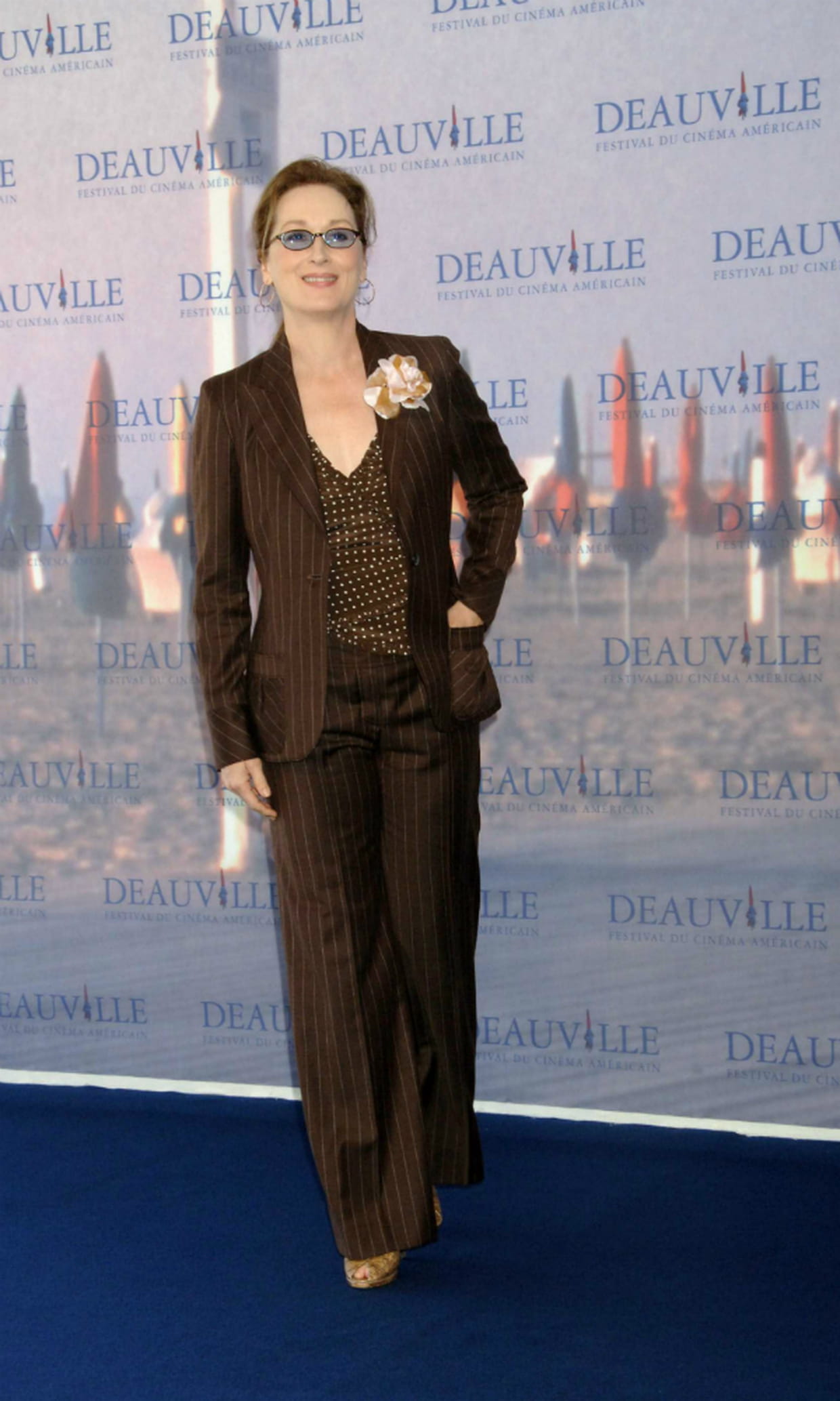 Meryl Streep en ensemble de costume marron et broche fleur au Festival du film de Deauville le 9 septembre 2006.