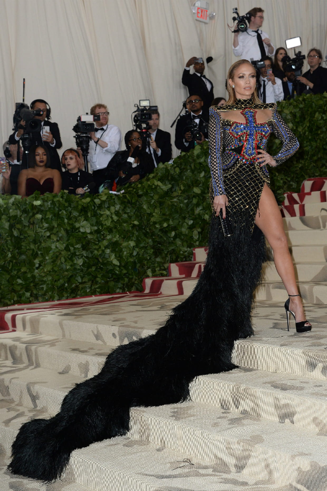 Jennifer Lopez en robe fendue à traîne Balmain au Met Gala à New York le 7 mai 2018.
