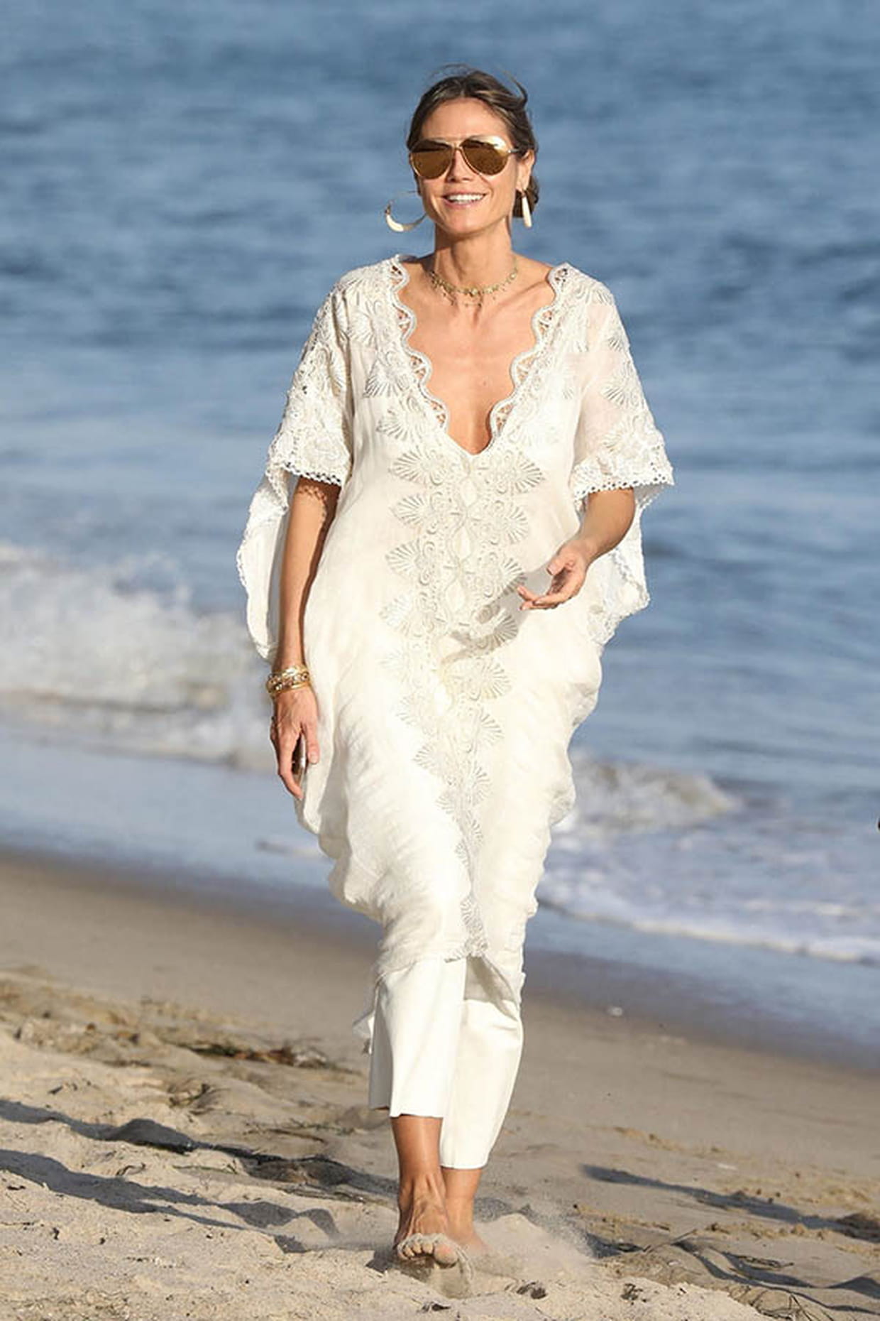 Heidi Klum en robe blanche brodée et pantalon assorti sur une plage à Los Angeles le 1er octobre 2017.
