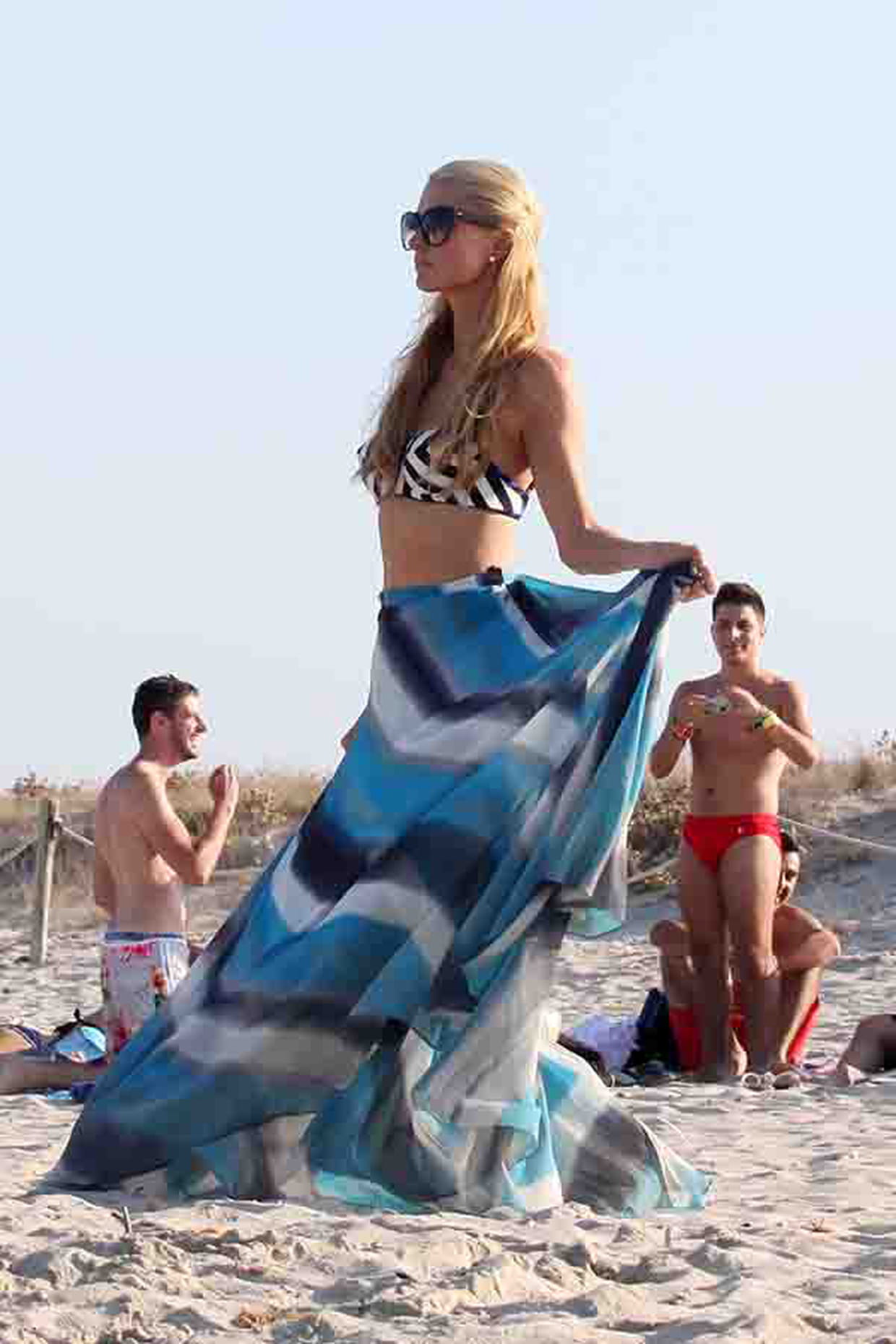 Paris Hilton en jupe longue tricolore et haut de maillot noir et blanc sur une plage à Formentera le 2 août 2014.