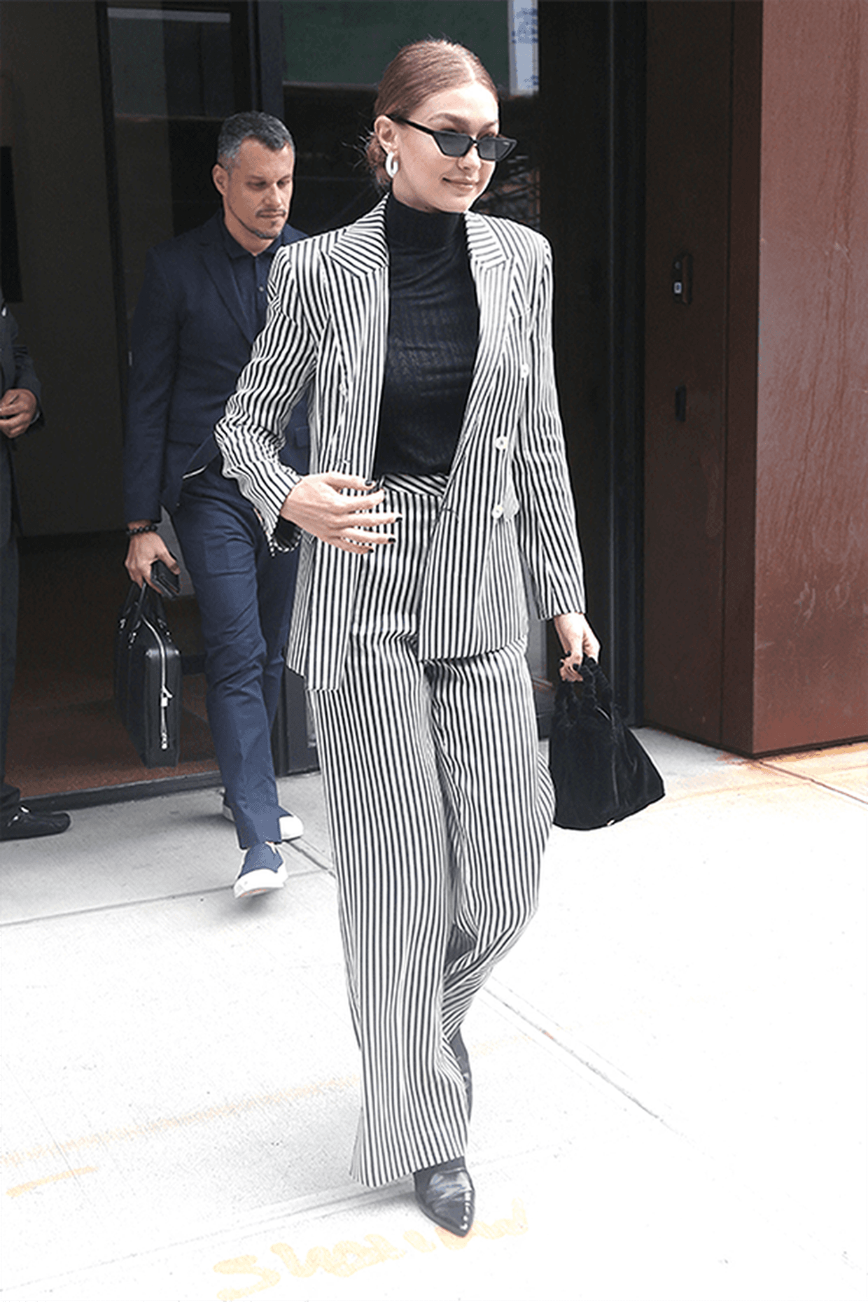 Le mannequin Gigi Hadid en costume rayé à New York en juin 2018