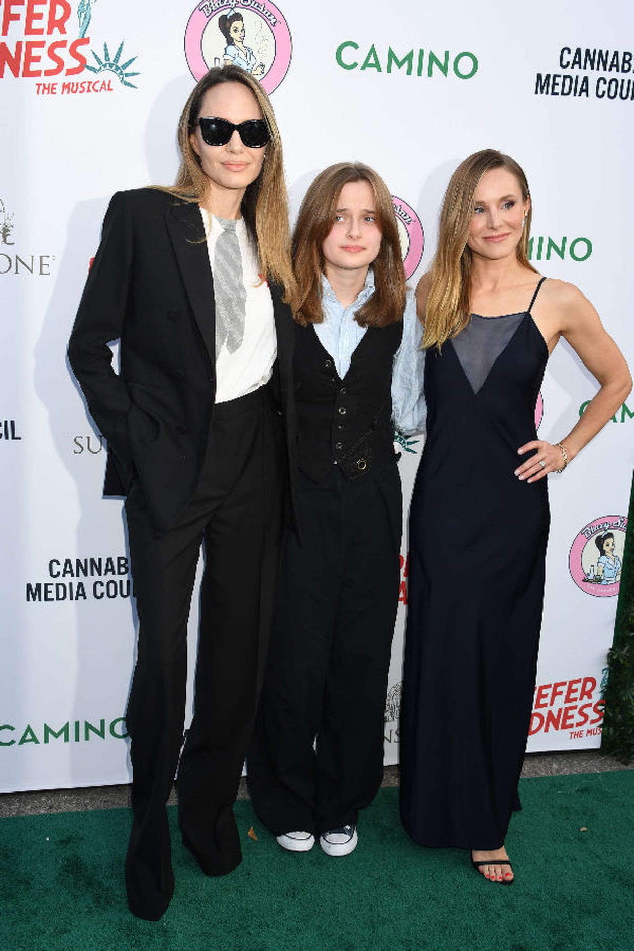 Angelina Jolie en tailleur pantalon noir et top imprimé avec sa fille Vivienne Jolie et Kristen Bell à l'avant-première du film Reefer Madness le 30 mai 2024.