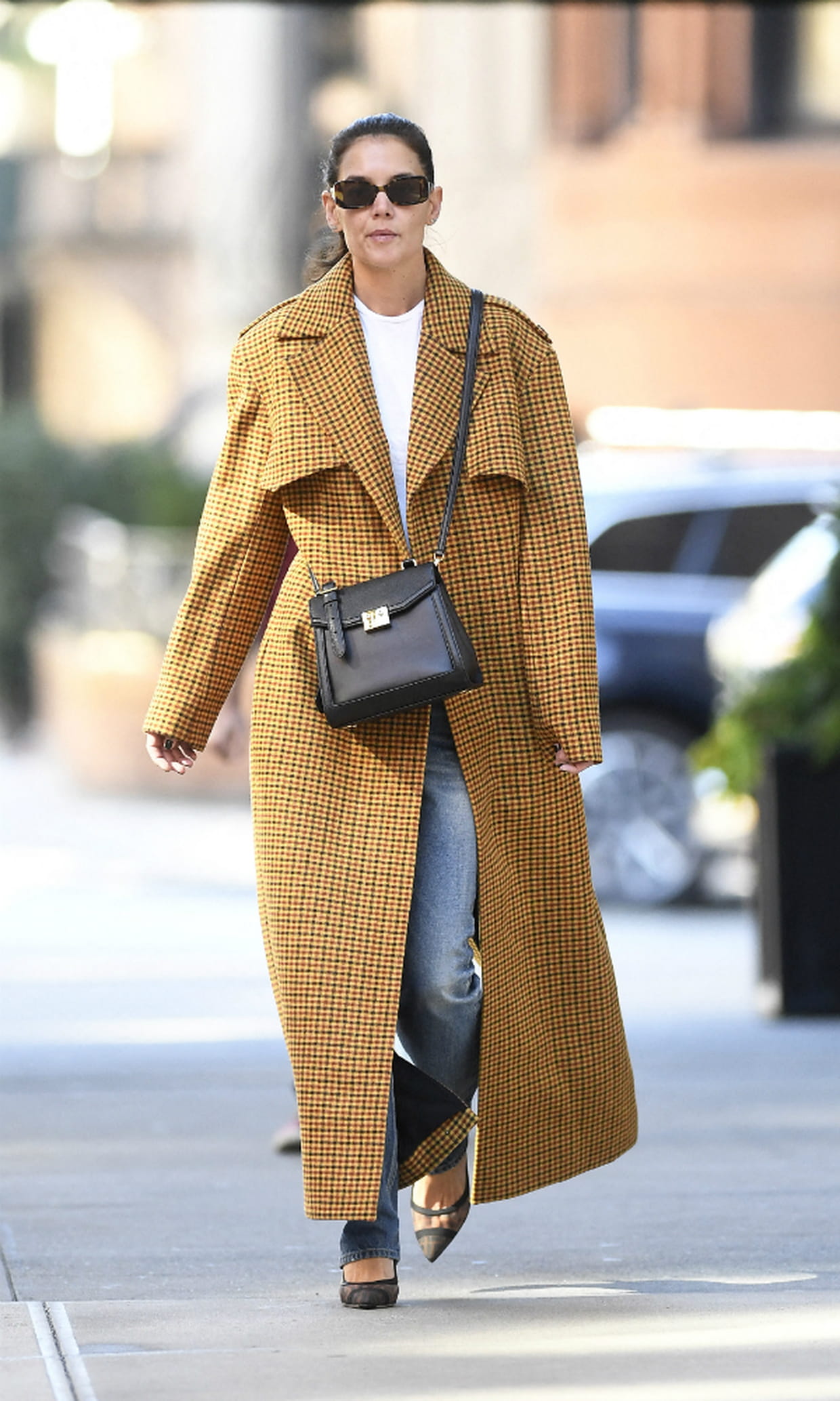 Katie Holmes en maxi manteau à carreaux à New York le 25 septembre 2019.