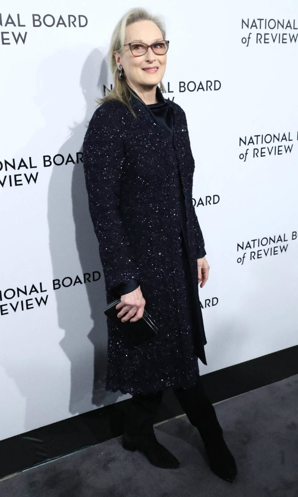 Meryl Streep en manteau noir brillant lors d'un gala à New York le 9 janvier 2018.