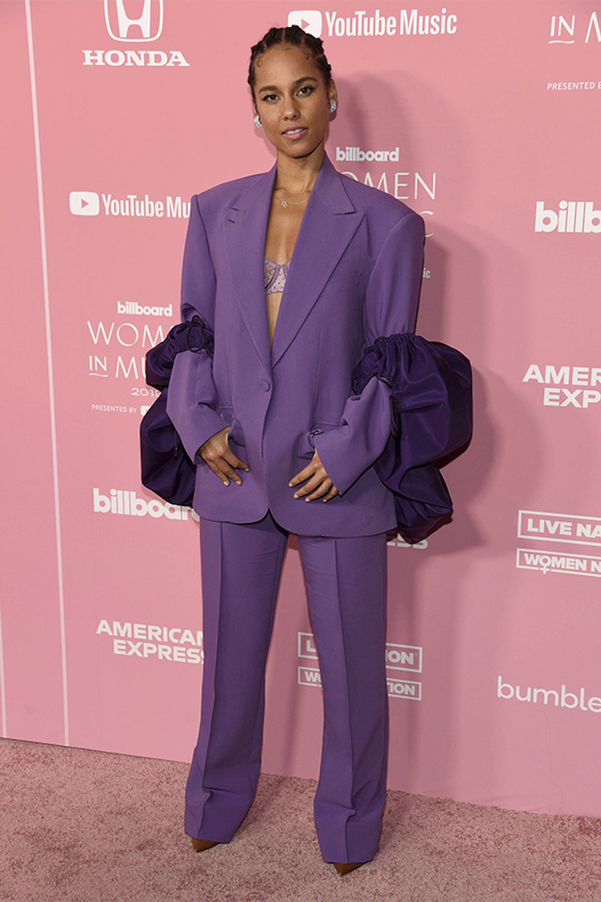 Alicia Keys en costume violet à manches graphiques à la cérémonie des Billboard Women in Music à Los Angeles le 12 décembre 2019.