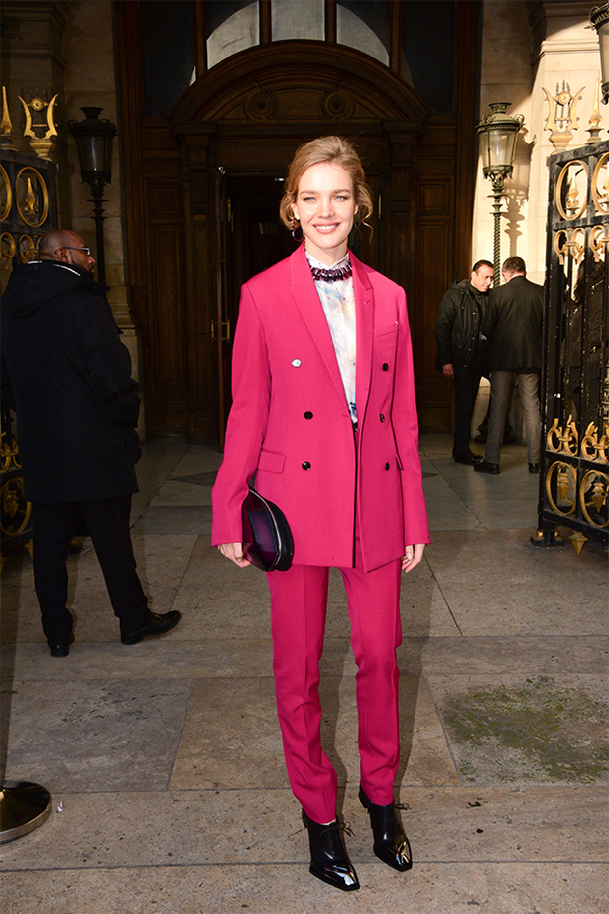 Natalia Vodianova en costume fuchsia et chemise blanche