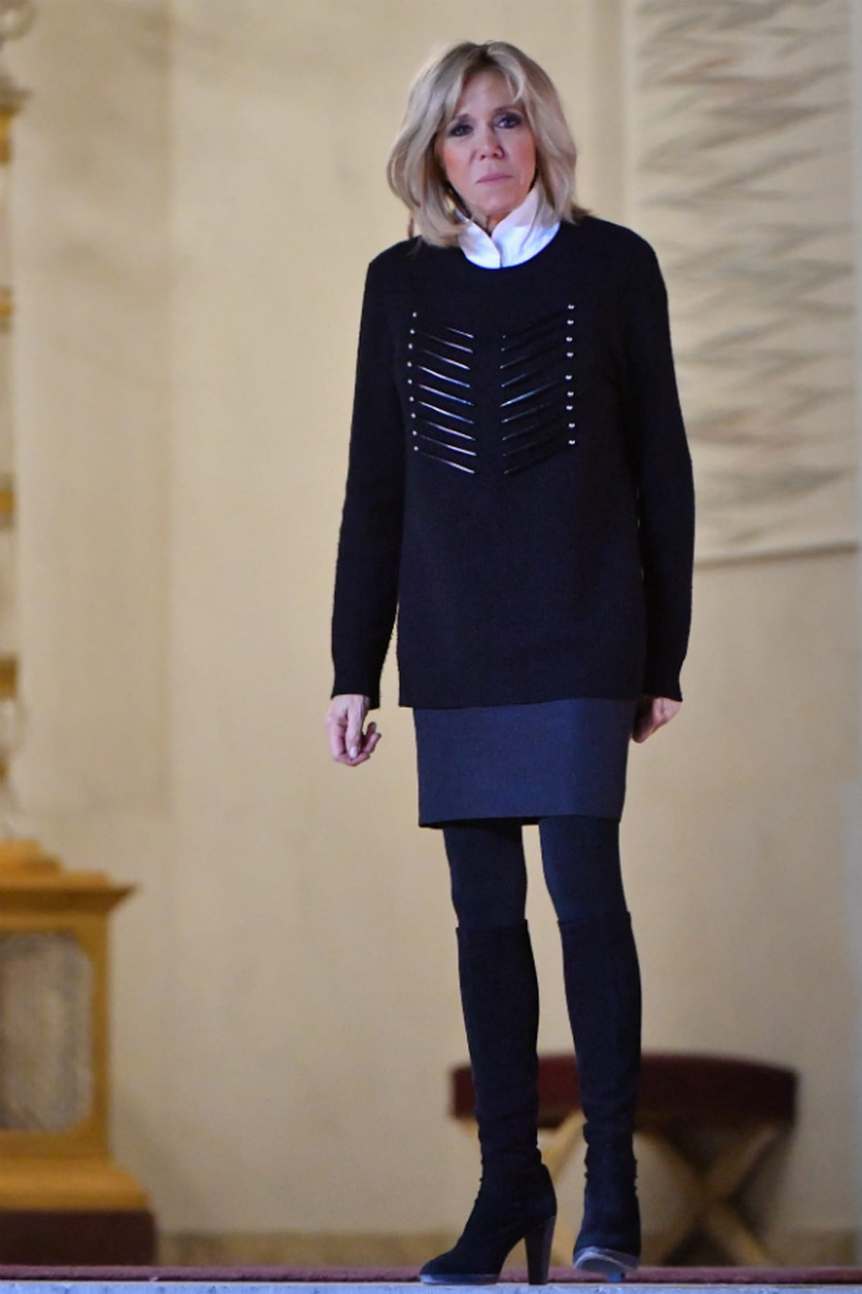 Brigitte Macron en jupe droite bleu marine Louis Vuitton et pull noir ajouré