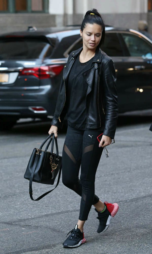 Adriana Lima en baskets noir et rouge LQD CELL SHATTER XT de Puma dans les rues de New York le 12 octobre 2018.