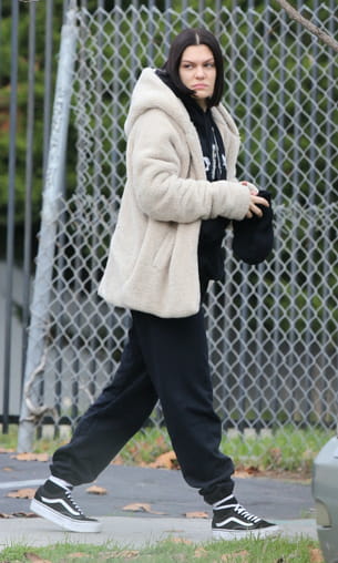 Jessie J en baskets noires compensées Old Skool de Vans dans les rues de Los Angeles le 25 décembre 2019.