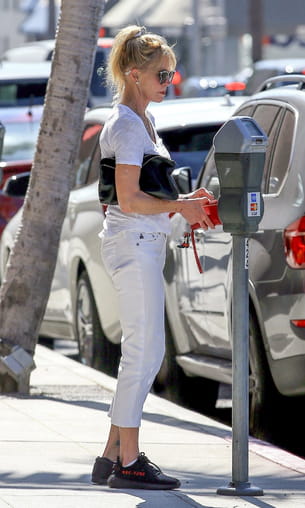 Melanie Griffith en baskets noires Boost 350 V2 de Yeezy x Adidas © Spread Pictures/ABACA