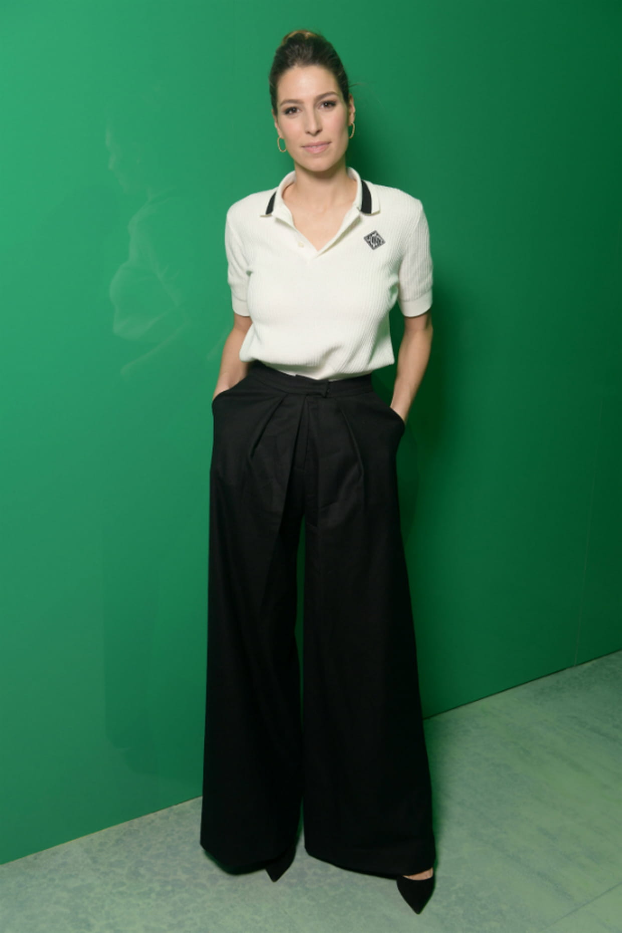 Laury Thilleman en polo blanc et pantalon ample au défilé Lacoste à Paris le 5 mars 2019.