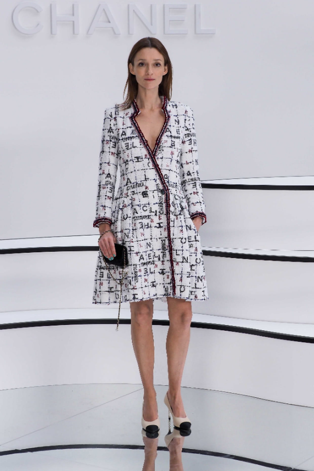 Audrey Marnay (1980) en robe tweed courte au défilé Chanel à Paris le 3 mars 2020.