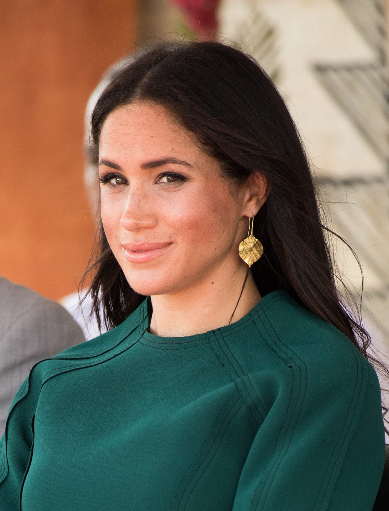 Meghan Markle avec des boucles Pippa Small en forme de feuille dorée aux Fiji le 25 octobre 2018