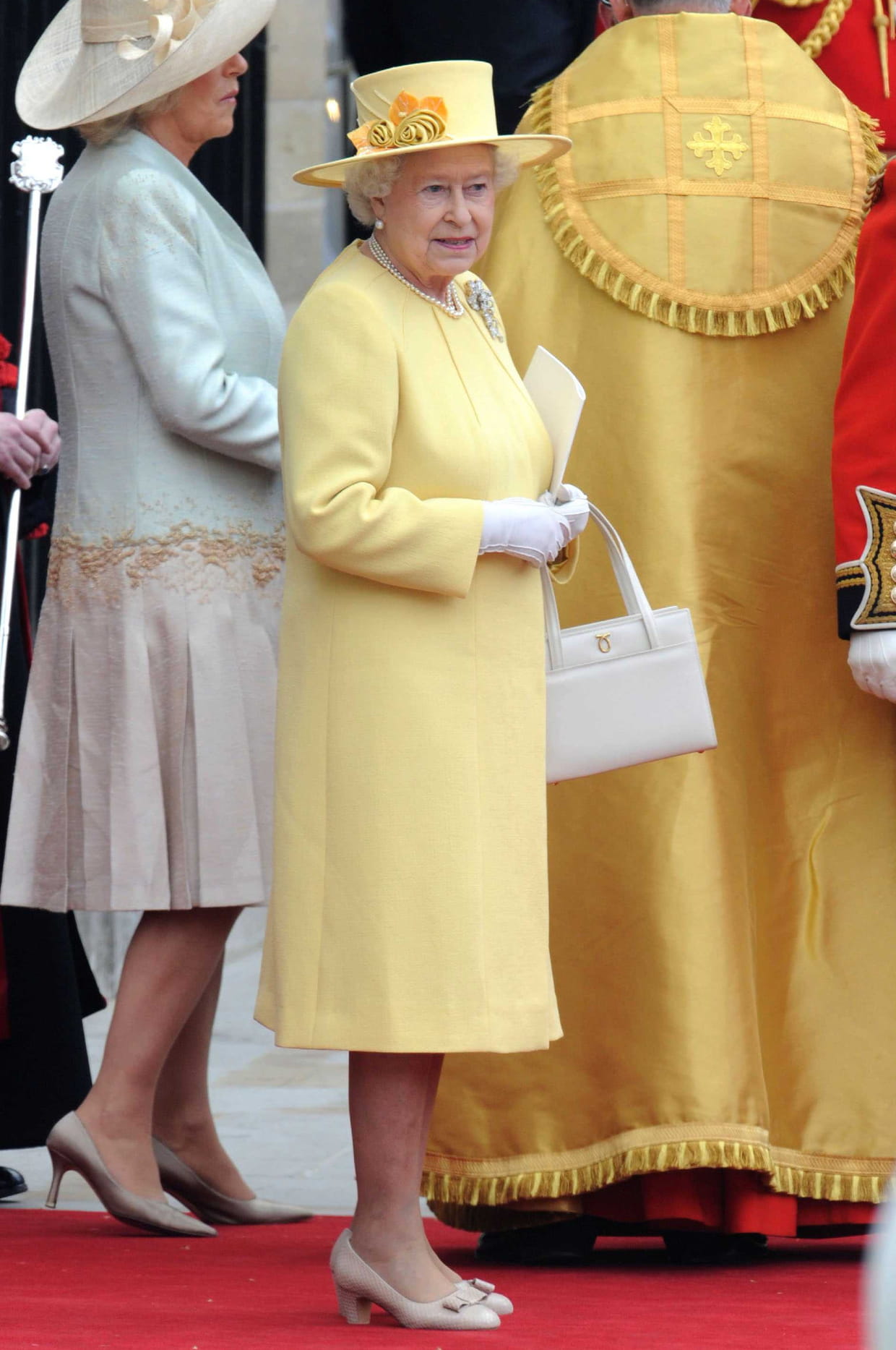 La reine Elizabeth II en robe et chapeau jaunes à Londres le 29 avril 2011.