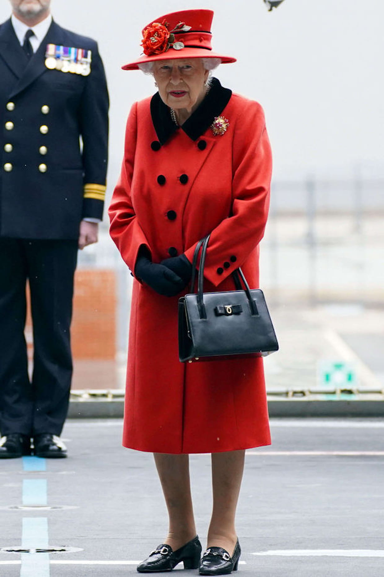 La reine Elizabeth II en robe manteau rouge à Portsmouth le 22 mai 2021.