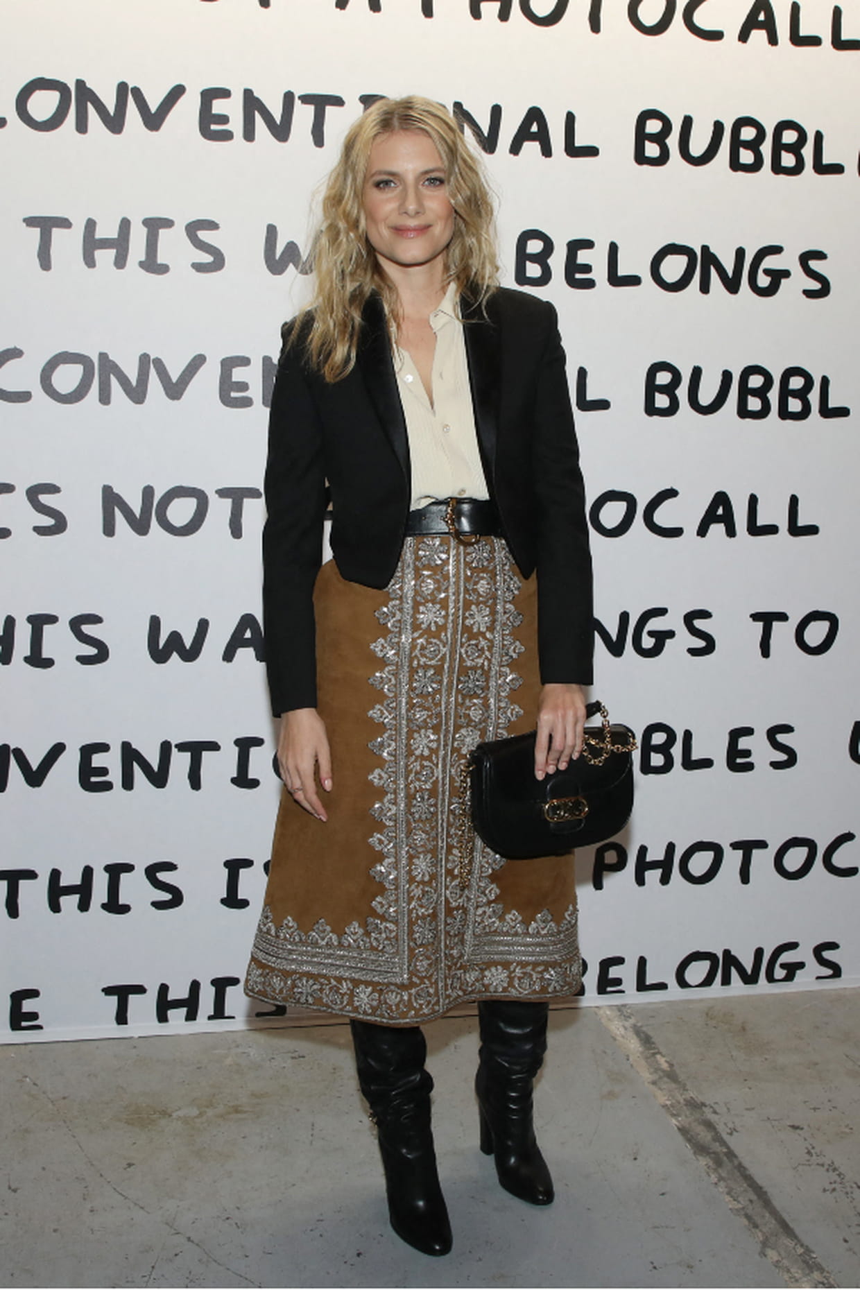Mélanie Laurent en jupe longue en daim et blazer court à l'exposition Bubbles à l'opéra Bastille de Paris le 5 mars 2020.