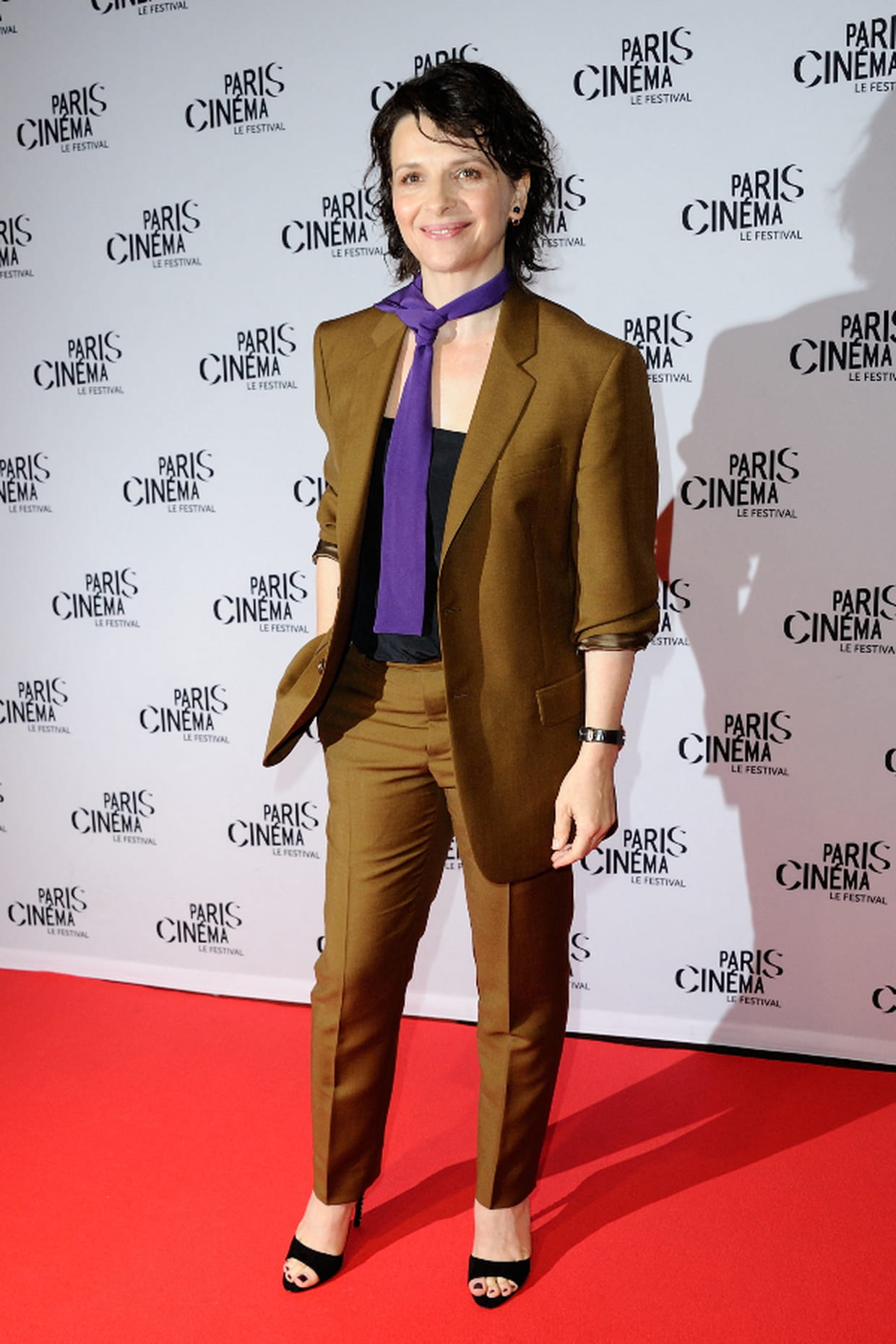 Juliette Binoche en costume brun et cravate violette au Festival du film de Paris le 9 juillet 2014.