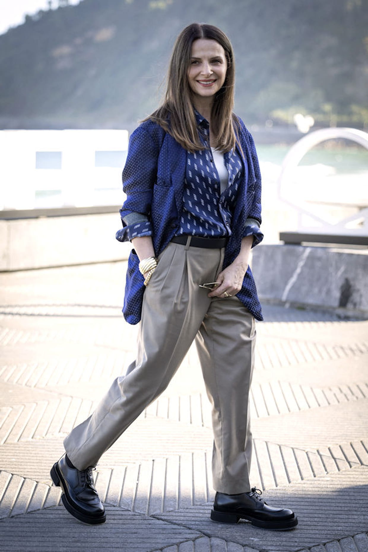 Juliette Binoche en chemise bleue à imprimé et pantalon de costume beige ceinturé